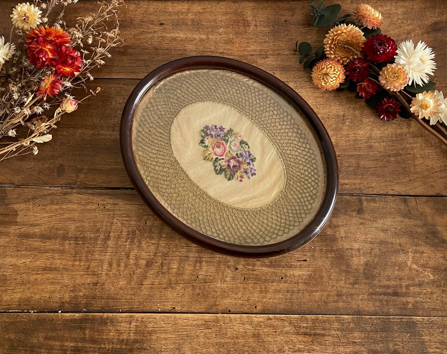 Alerte coup de coeur pour cette jolie broderie à poser estimée début 1900. On adore ses petits pieds ronds en laiton et la delicatesse de la broderie et de la dentelle. A noter, deux discrètes traces du temps sur le cadre visibles sur les photos.
