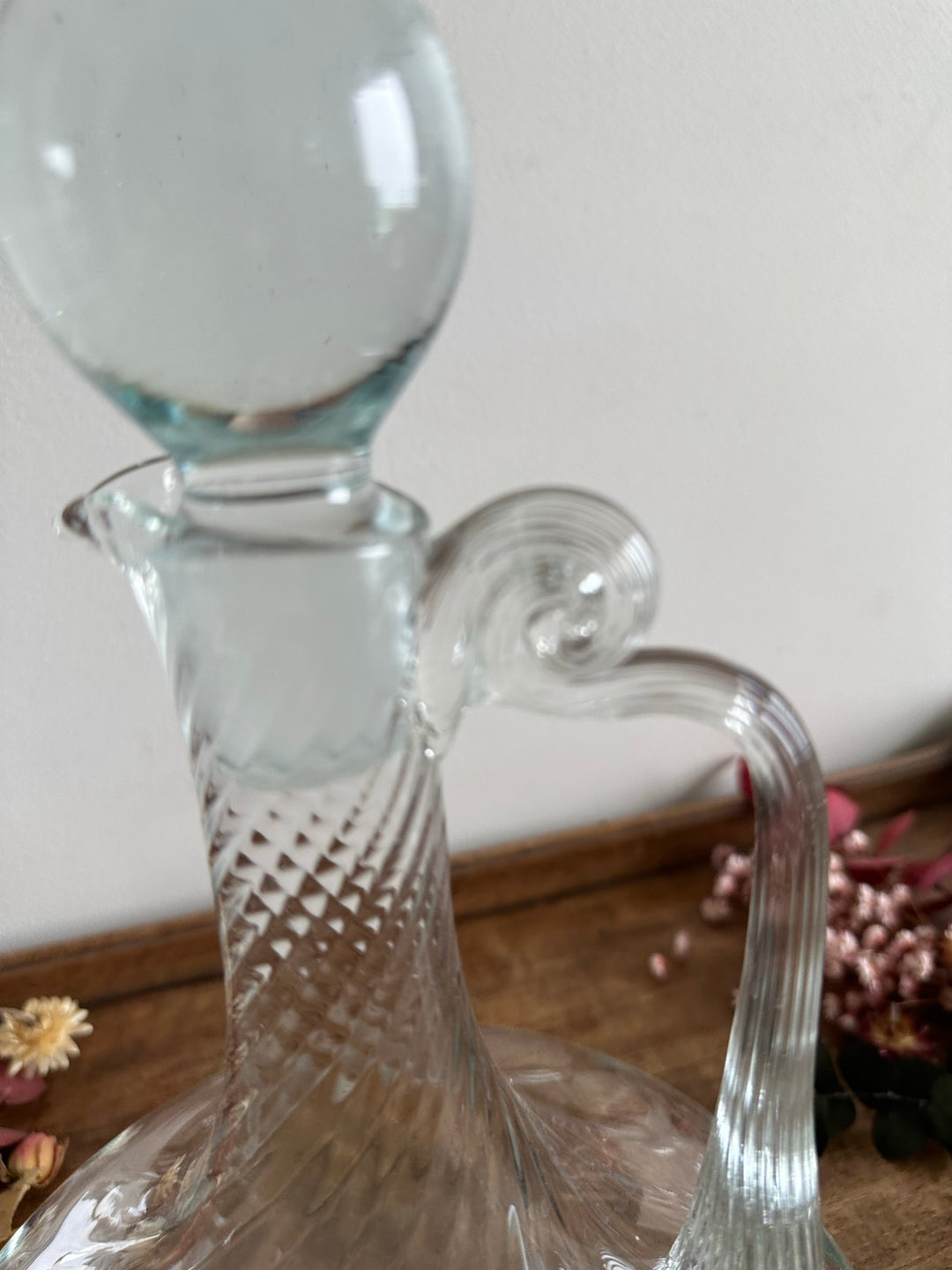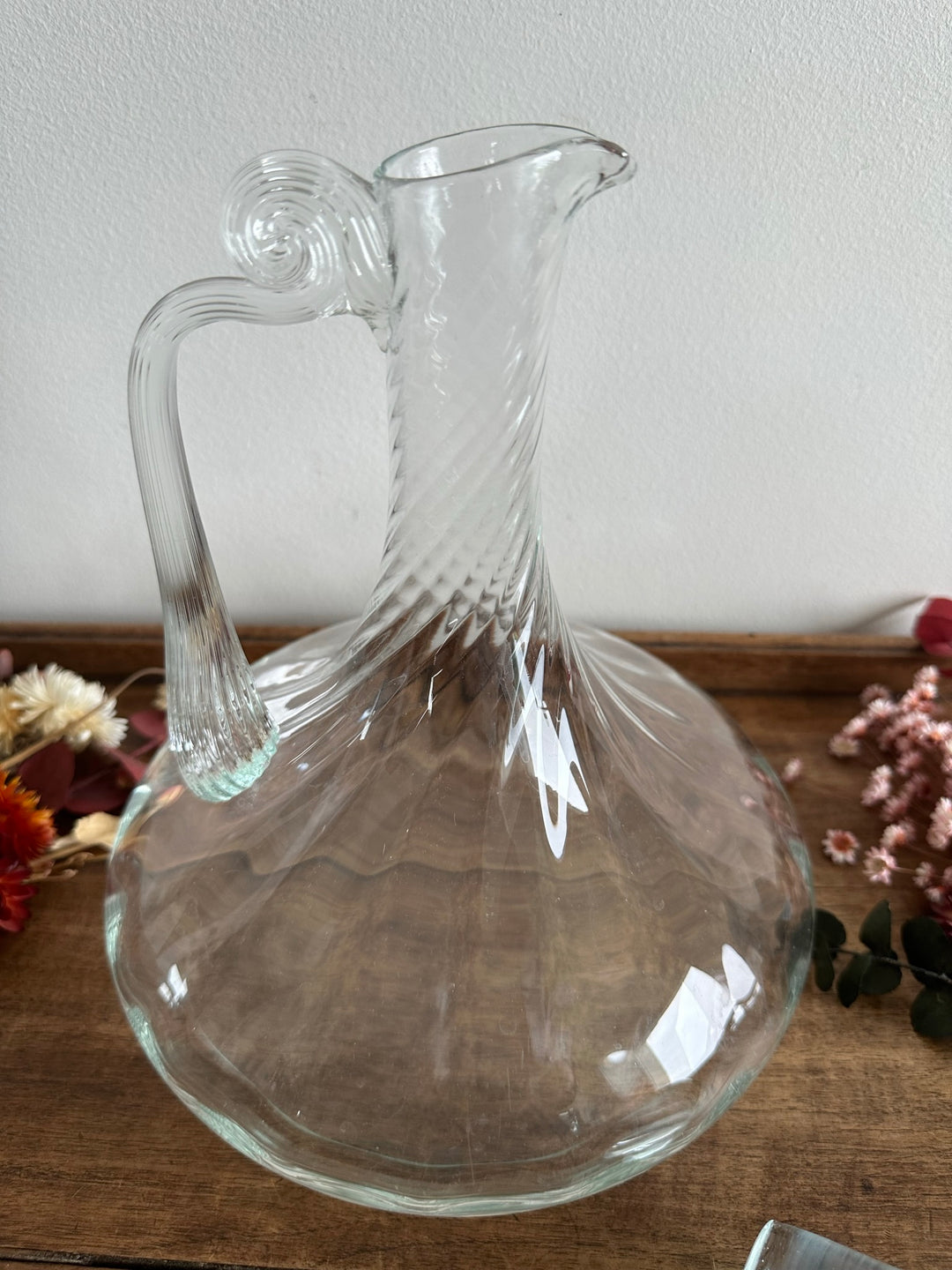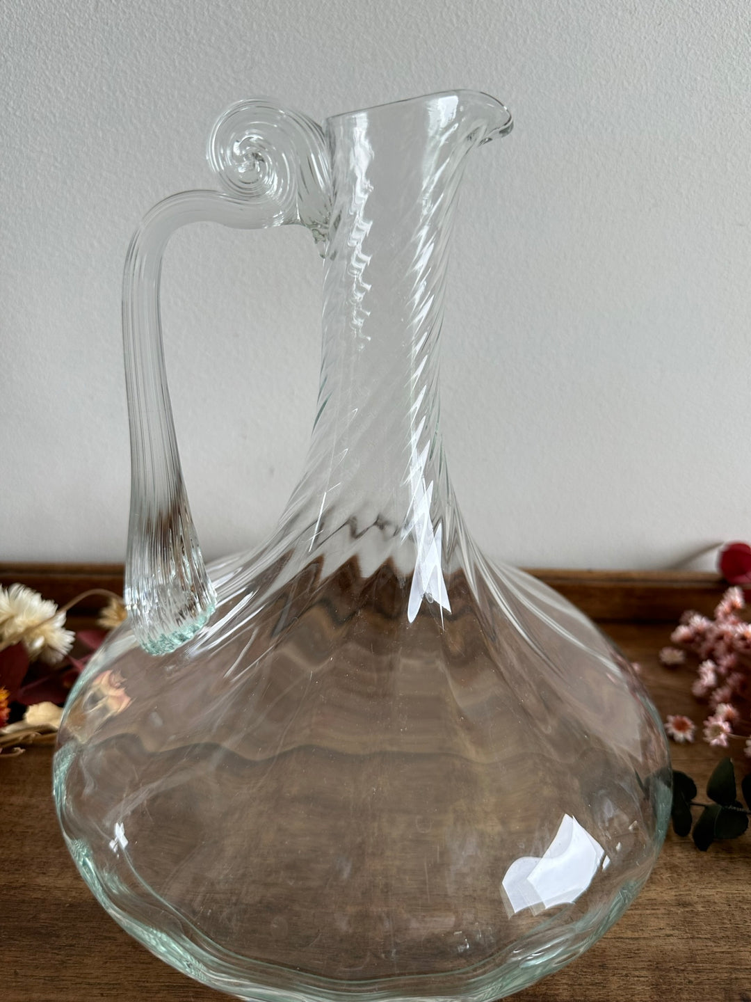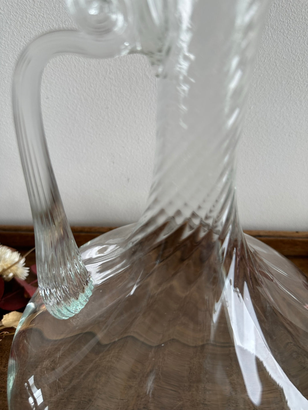 Belle carafe à vin, décanteur en verre moulé. On adore ses formes élégantes et son col torsadé