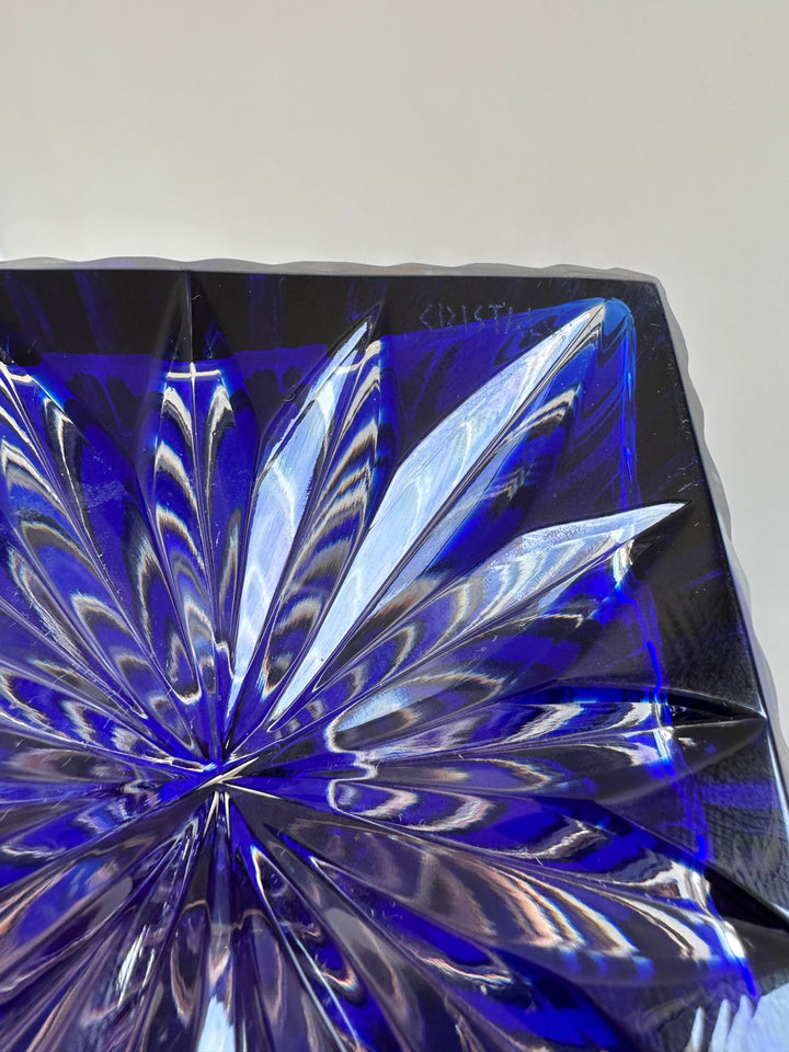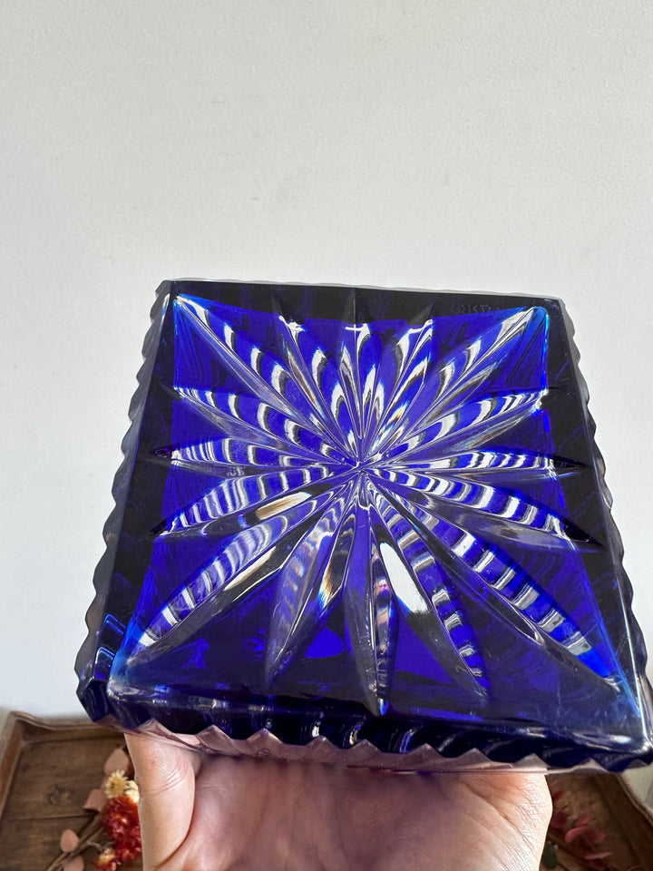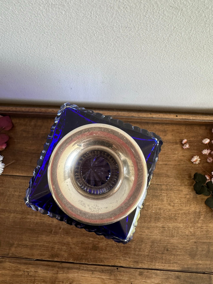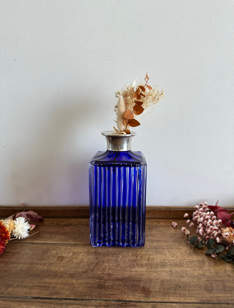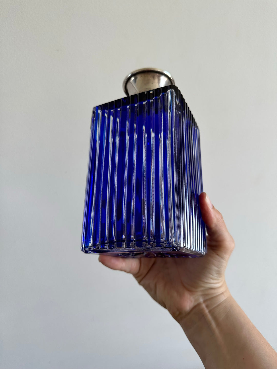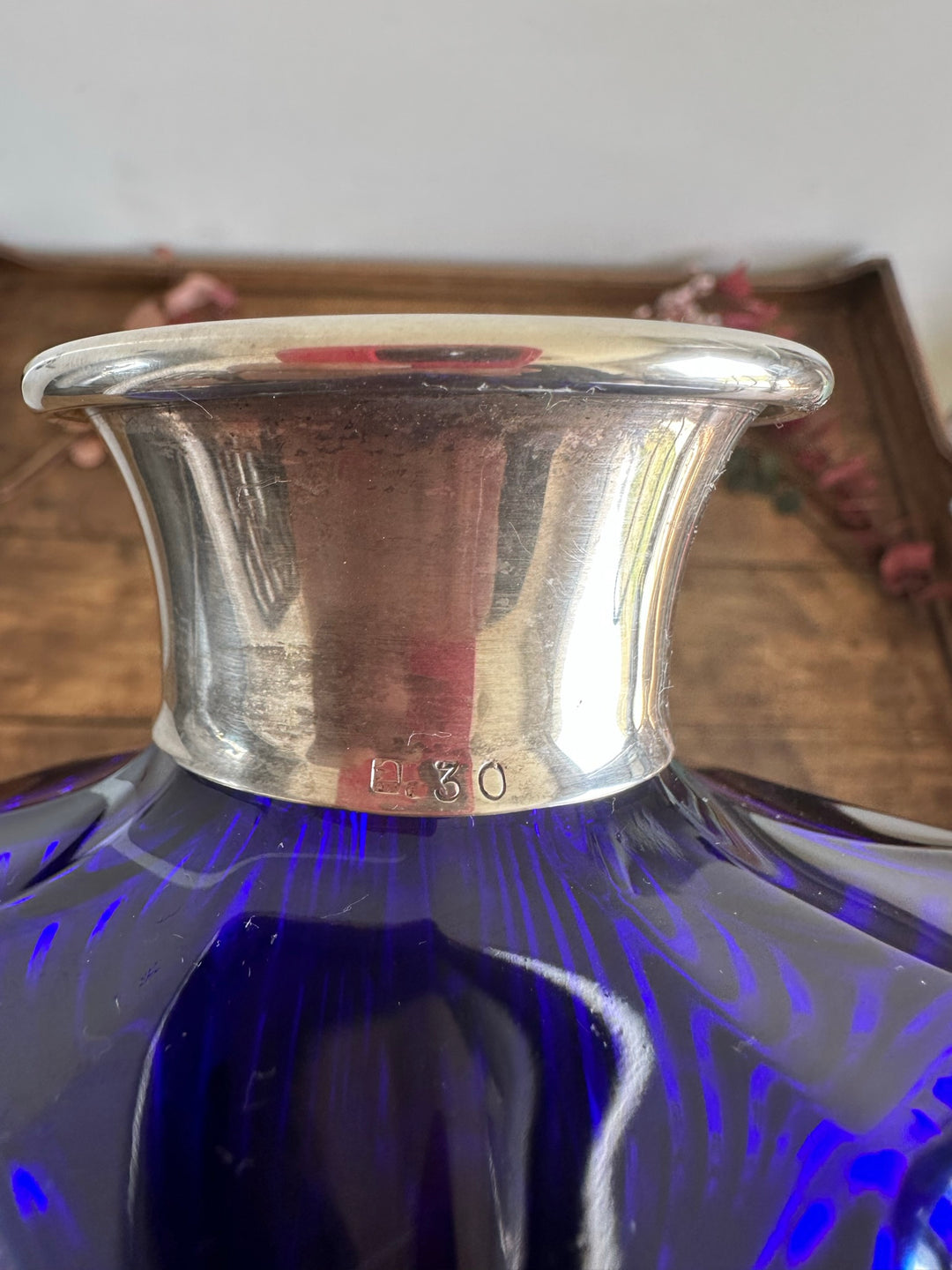 Élégante carafe en cristal strié et teinté en bleu de l'intérieur. Goulot en argent. Fera un excellent vase coloré pour vos jolis bouquets.