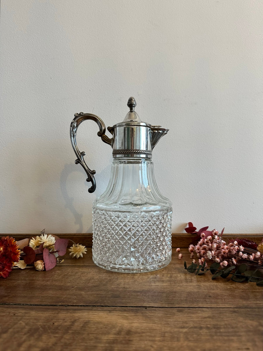 Magnifique carafe en verre et métal argenté. On adore sa patine, les détails travaillés de l'anse. A noter, très léger décalage au niveau du bec, visible sur les photos.