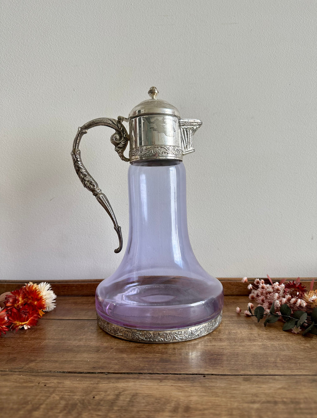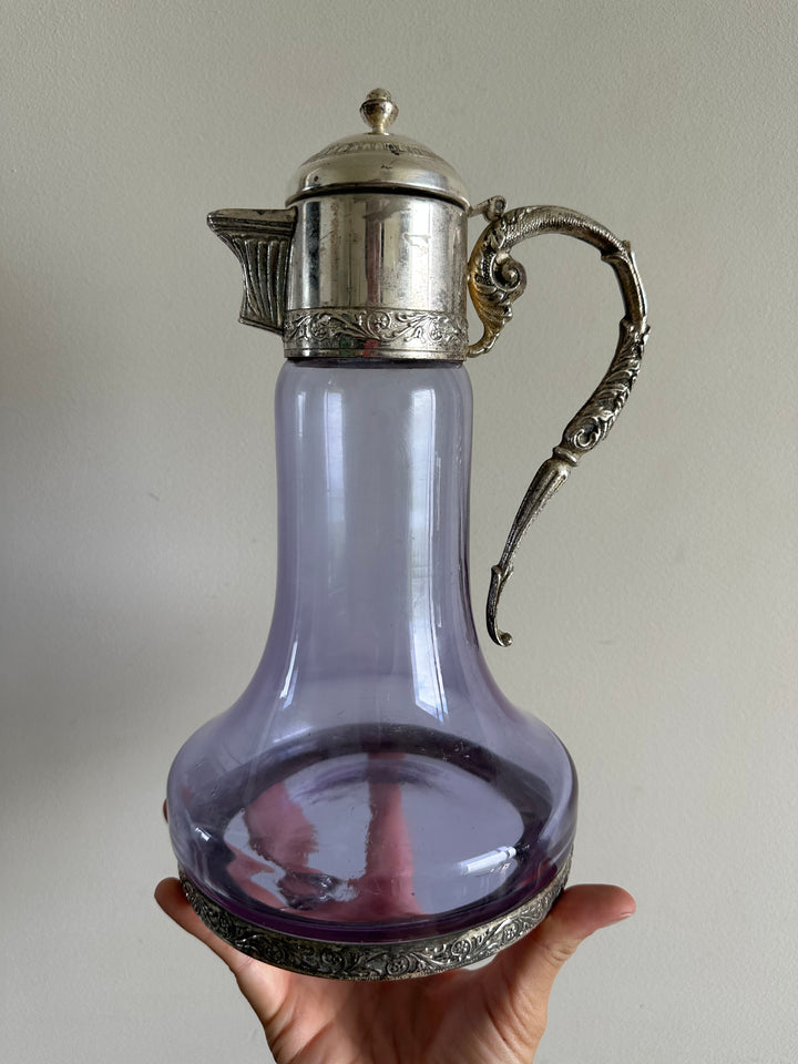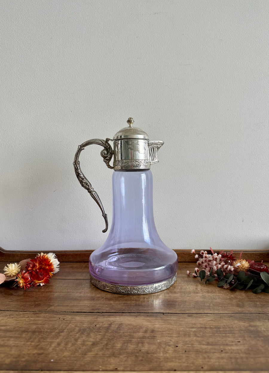 Carafe en verre violine bec et anse en métal argenté travaillés