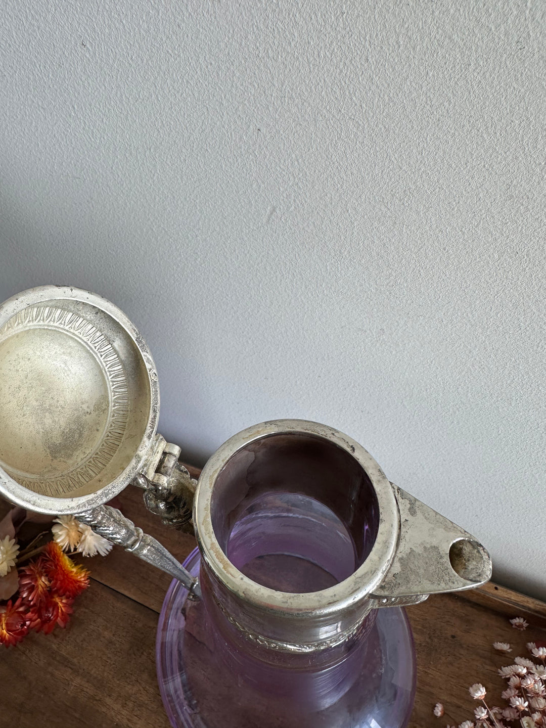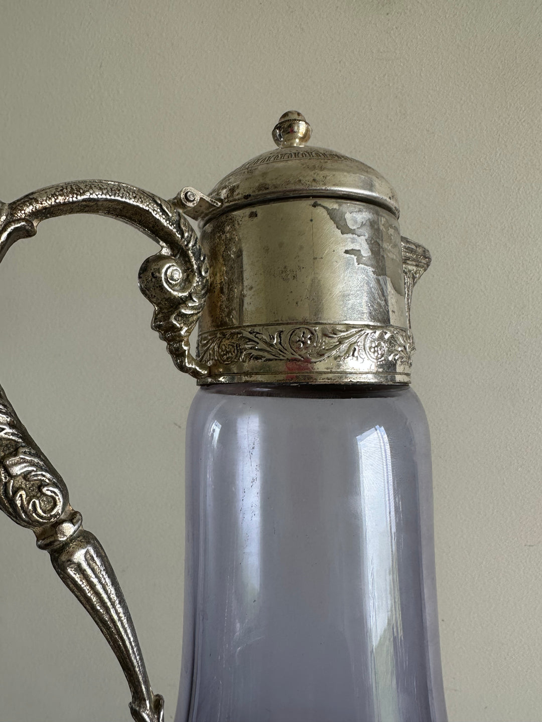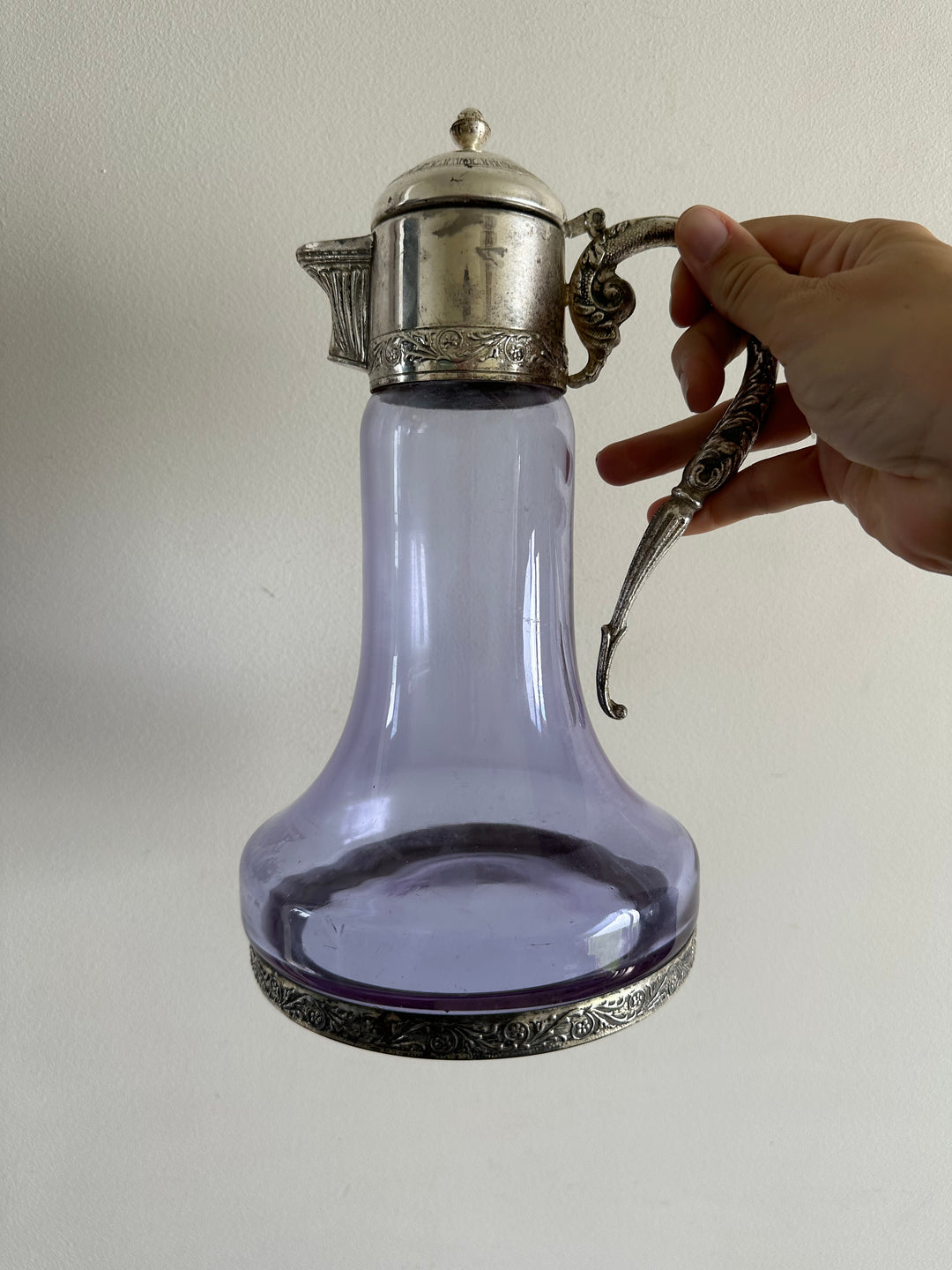 Carafe en verre violine bec et anse en métal argenté travaillés