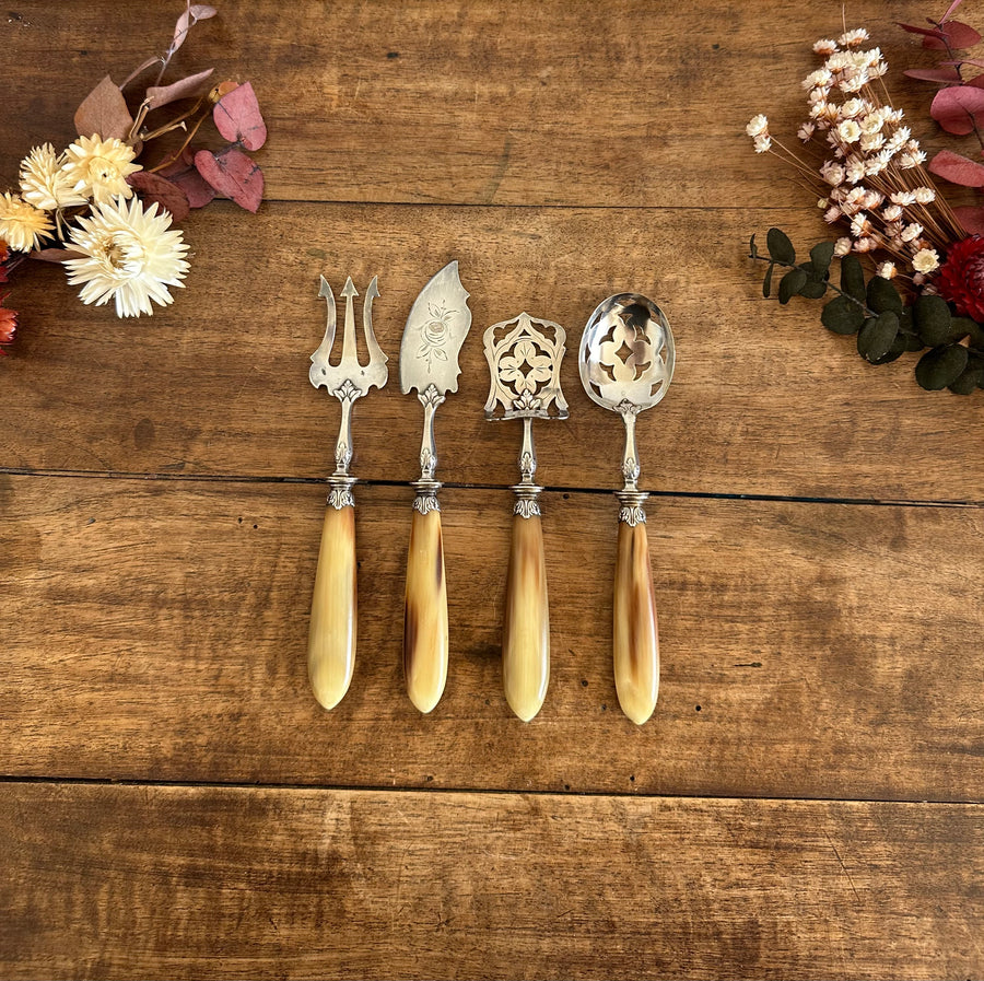 Ravissant ensemble de 4 couverts de service en métal argenté ajouré. Manche en bakélite. Estimation années 60; Vendus ensemble