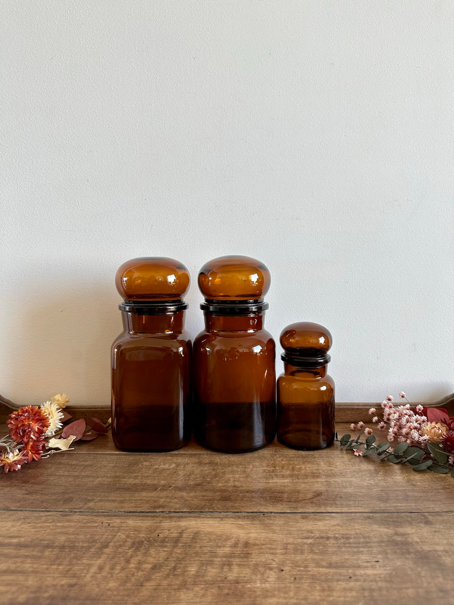Joli lot de flacons en verre très 70's. Bouchons hermétiques. Anciens pots à café signés Jacques Vabre Douwe Egberts made in belgium. De discrètes imperfections.