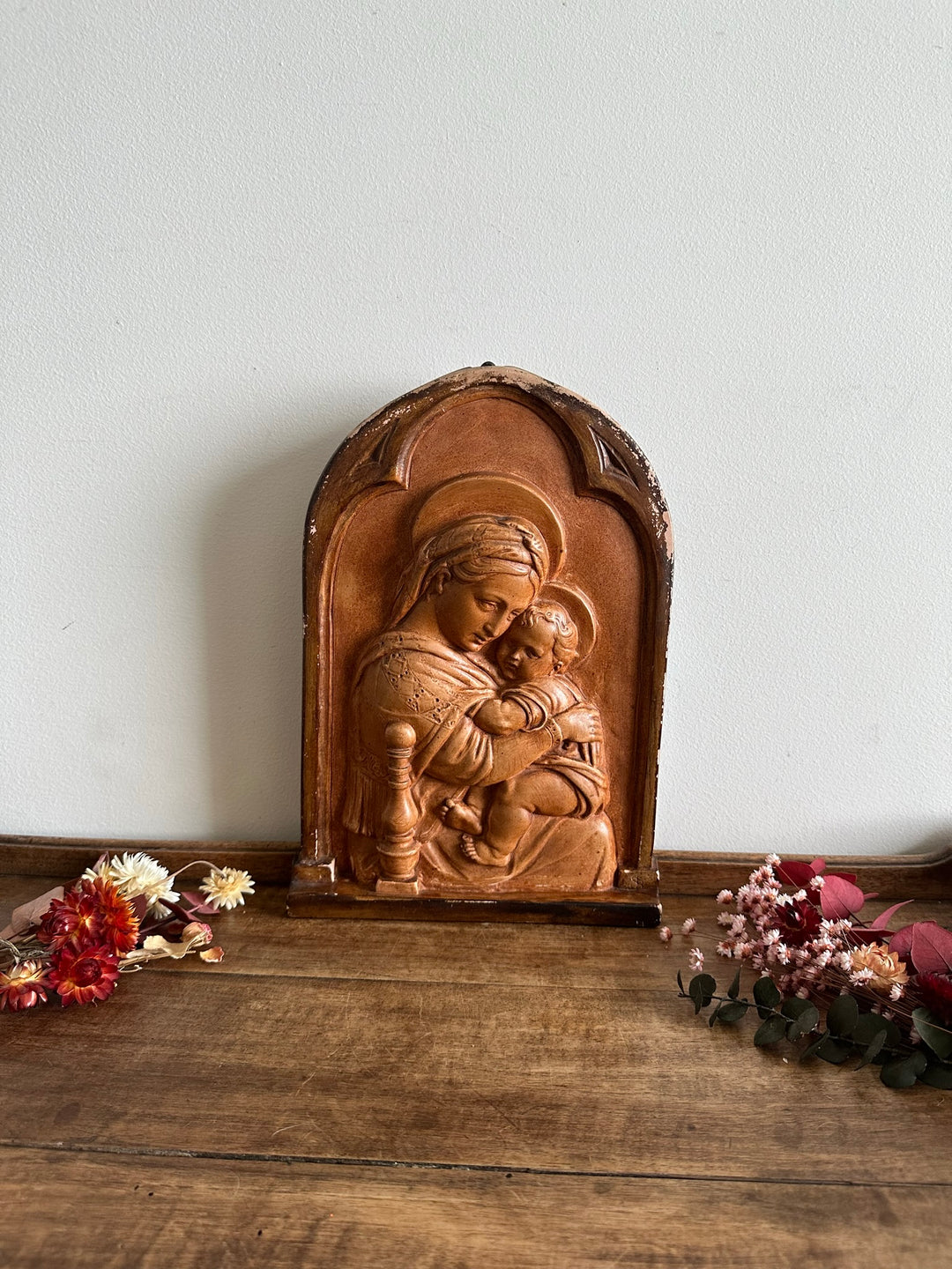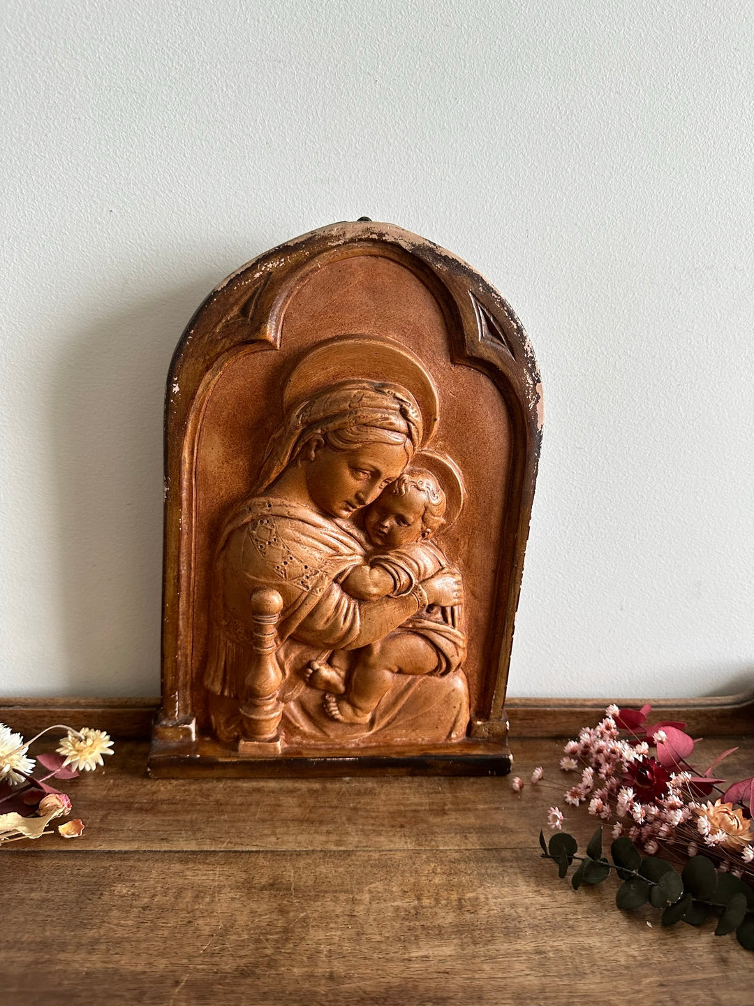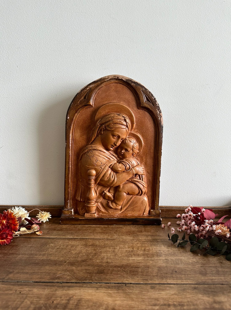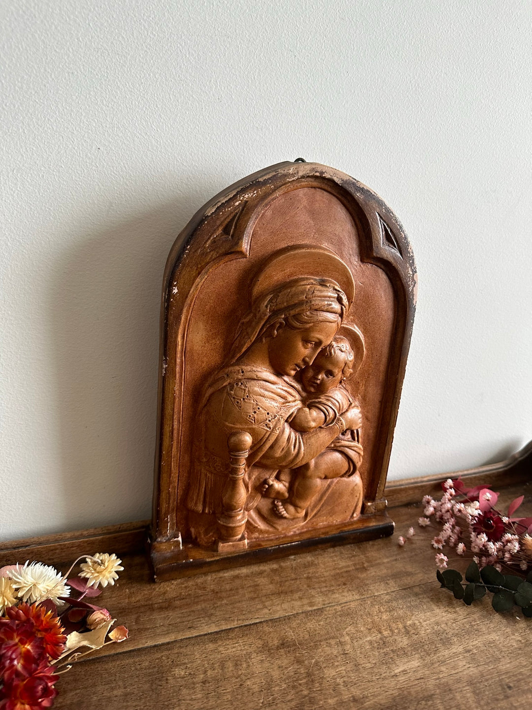 Très beau bas relief de la vierge et l'enfant. Icône en terre cuite effet bois à poser ou à accrocher. Objet lourd ayant vécu. Estimation début années 50