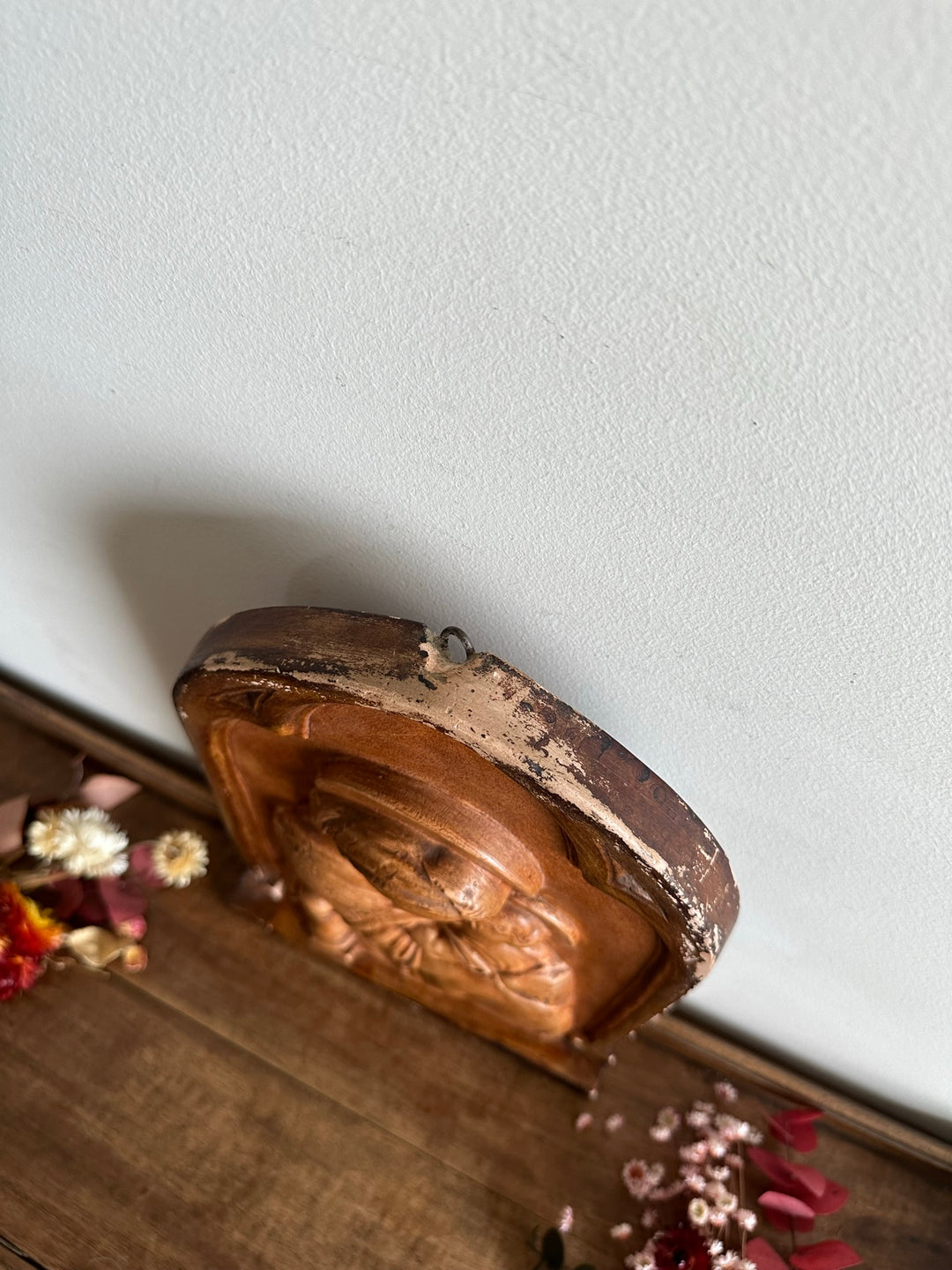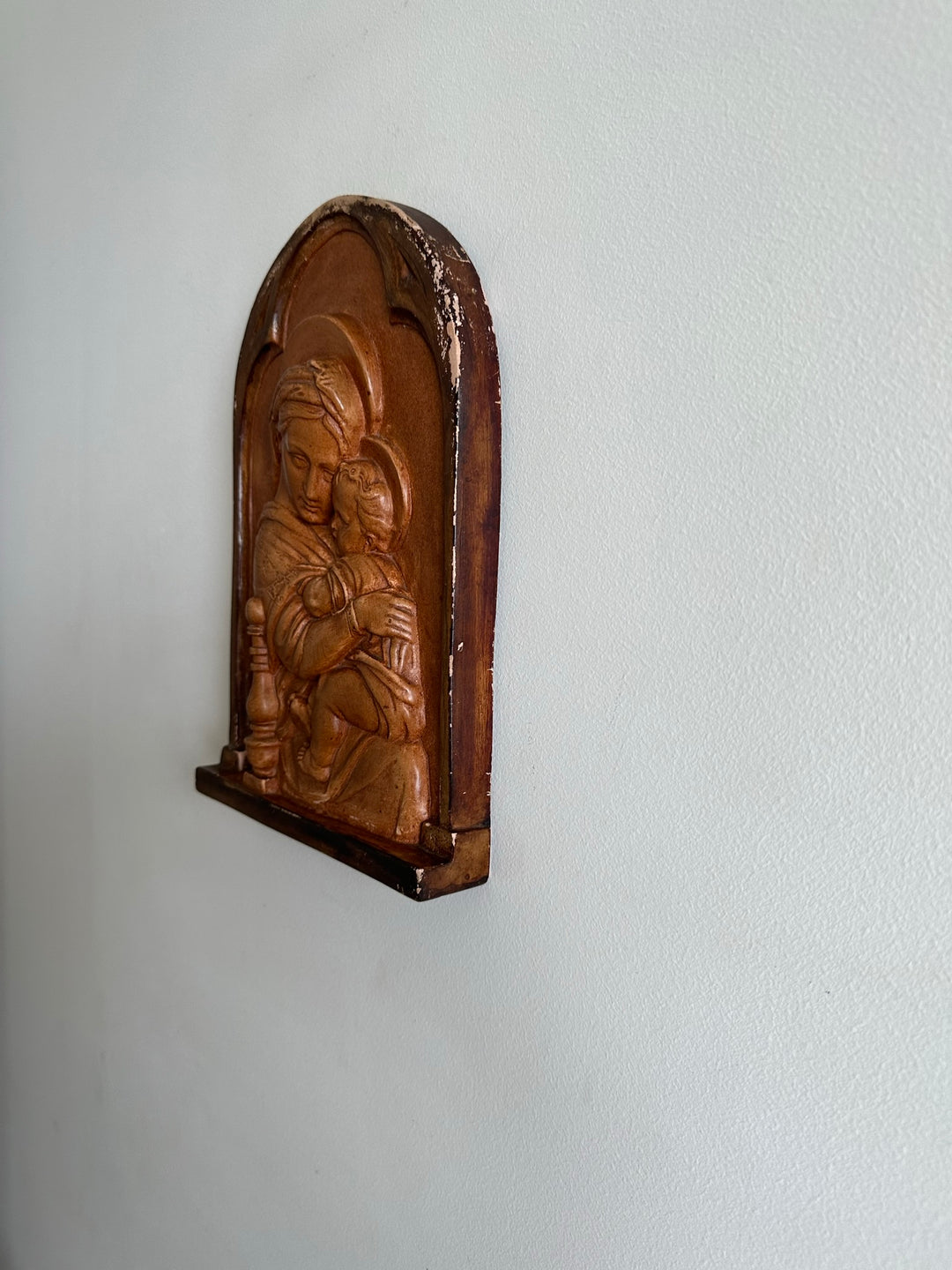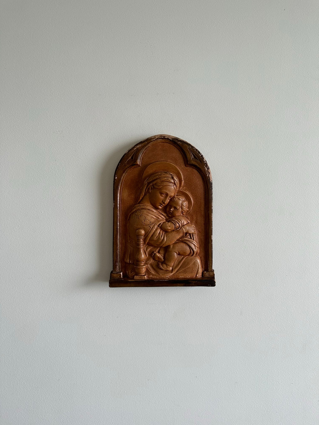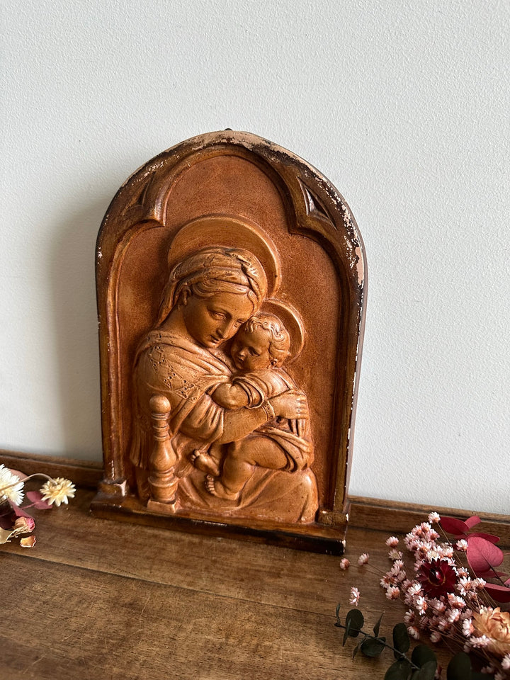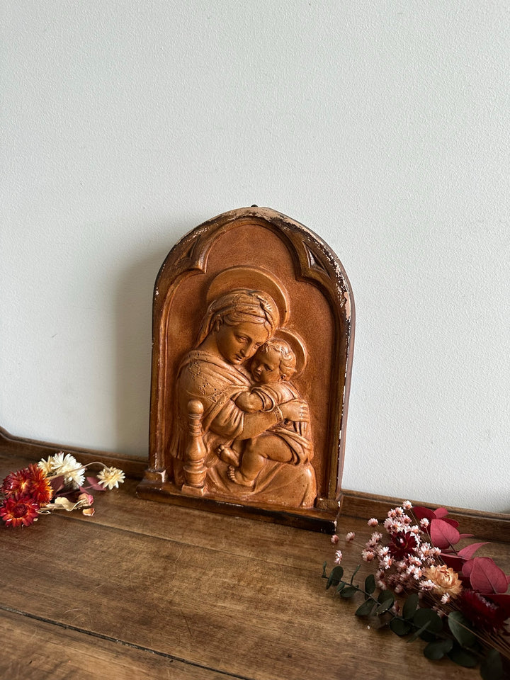 Très beau bas relief de la vierge et l'enfant. Icône en terre cuite effet bois à poser ou à accrocher. Objet lourd ayant vécu. Estimation début années 50