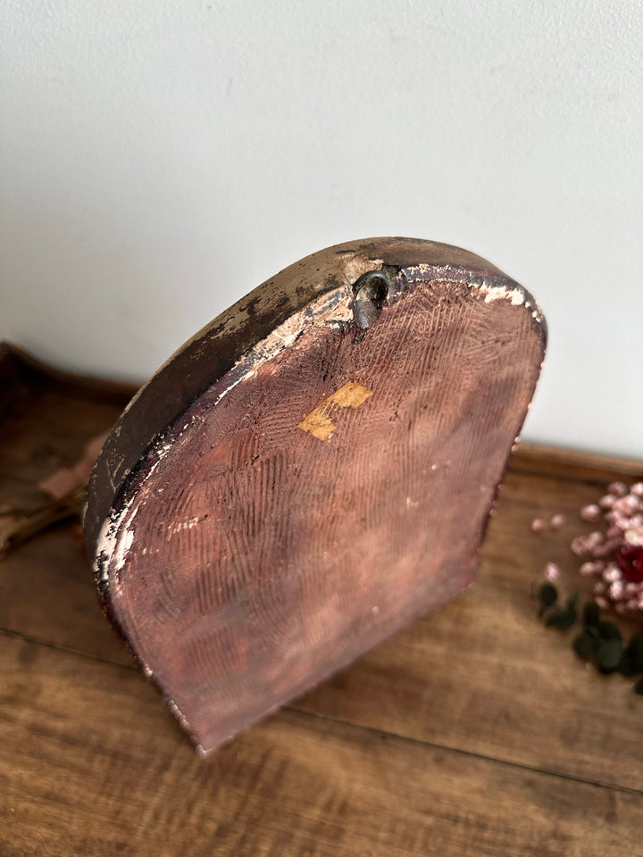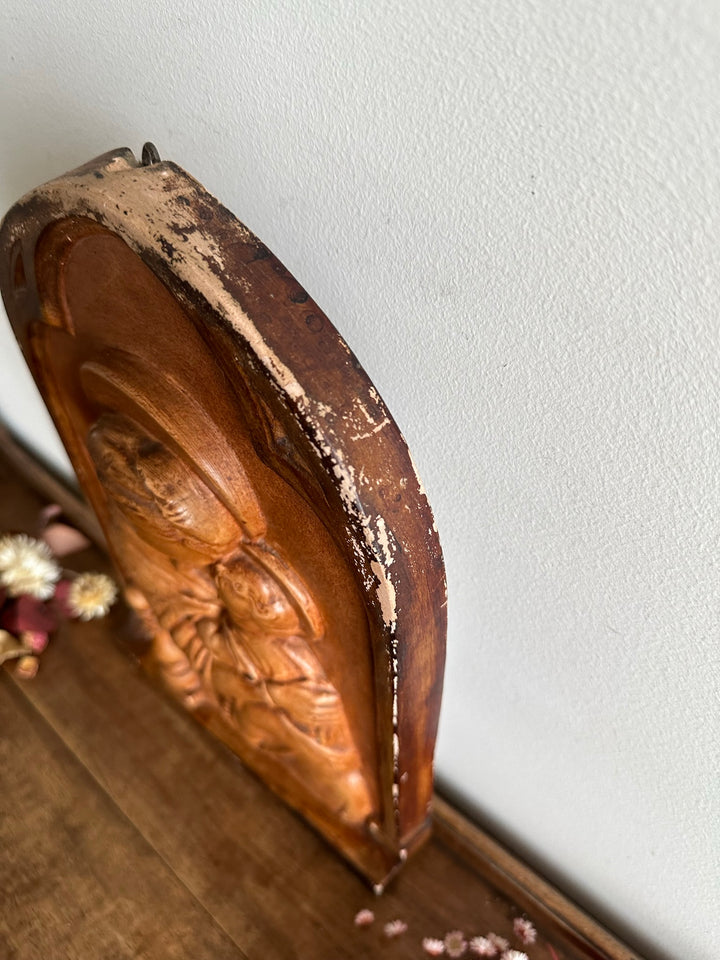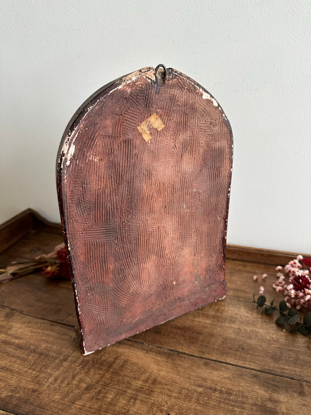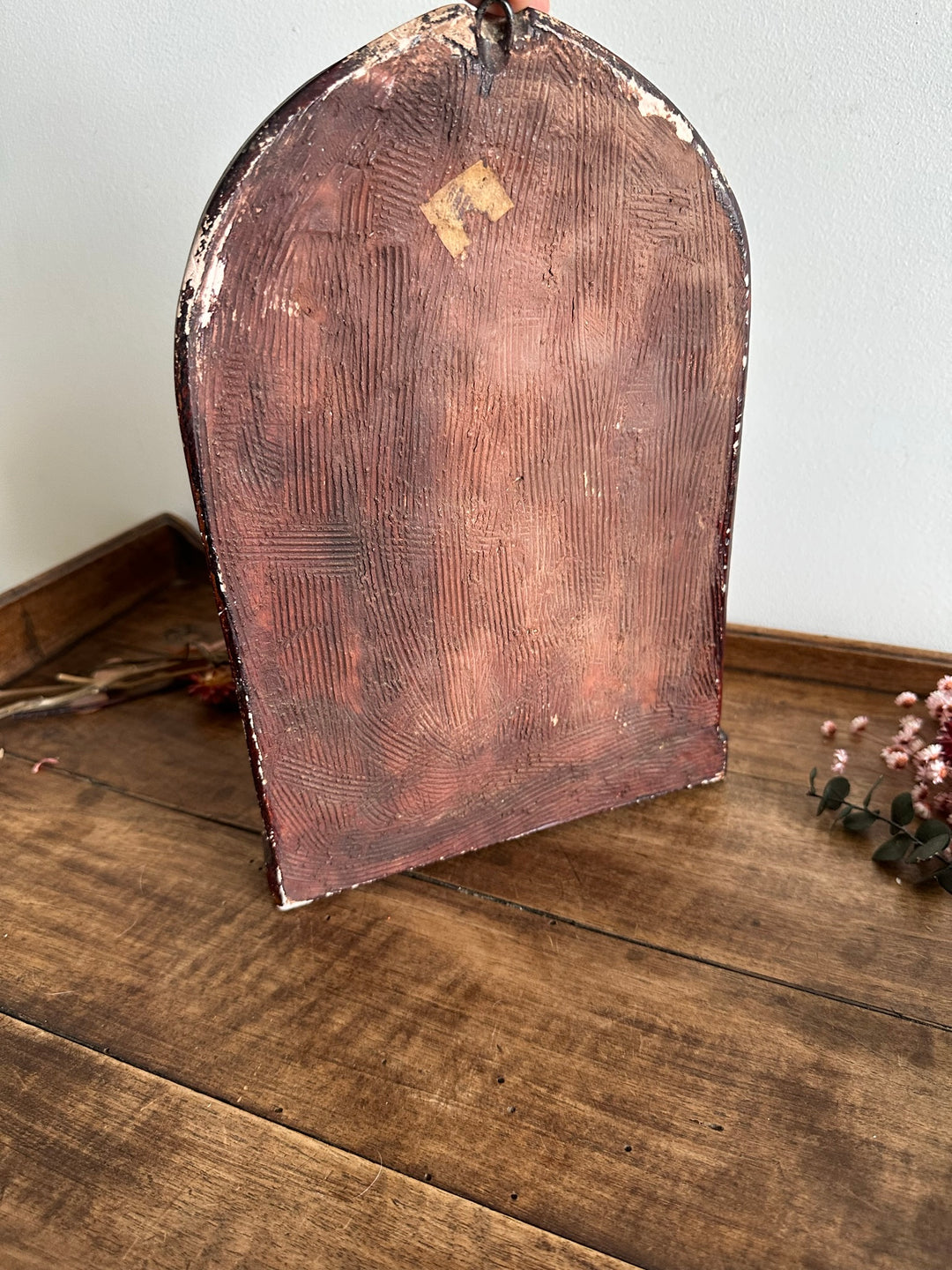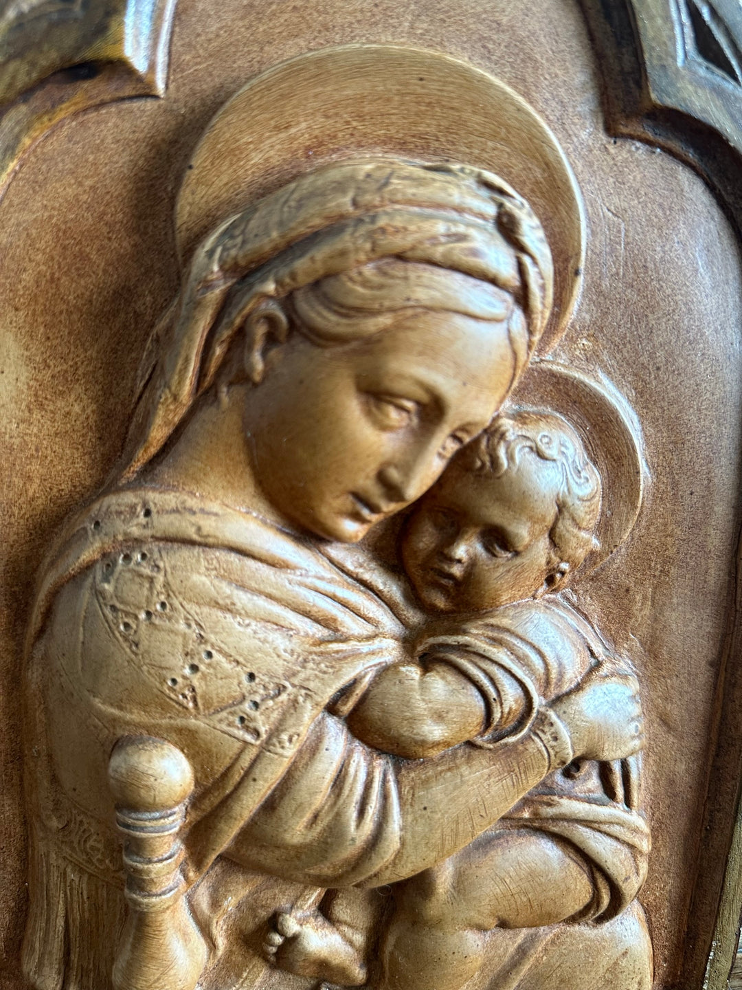 Très beau bas relief de la vierge et l'enfant. Icône en terre cuite effet bois à poser ou à accrocher. Objet lourd ayant vécu. Estimation début années 50