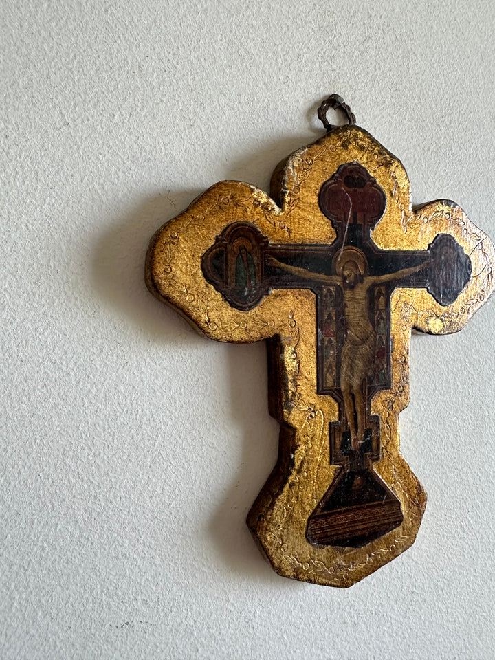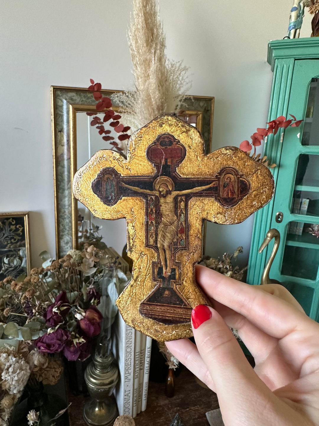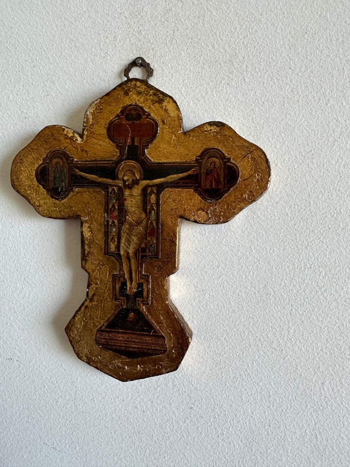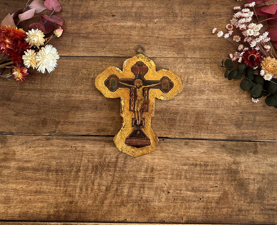 Adorable petite icône crucifix en bois doré. Estimation années 50. Objet imparfait qui présente de jolies traces du temps.