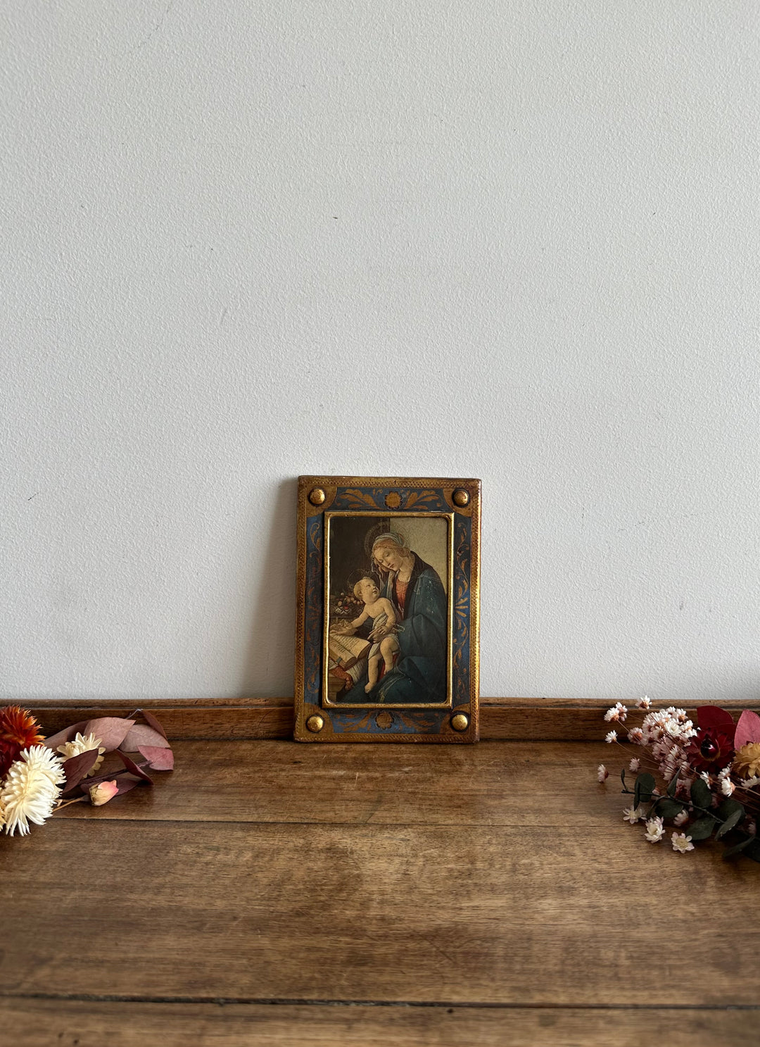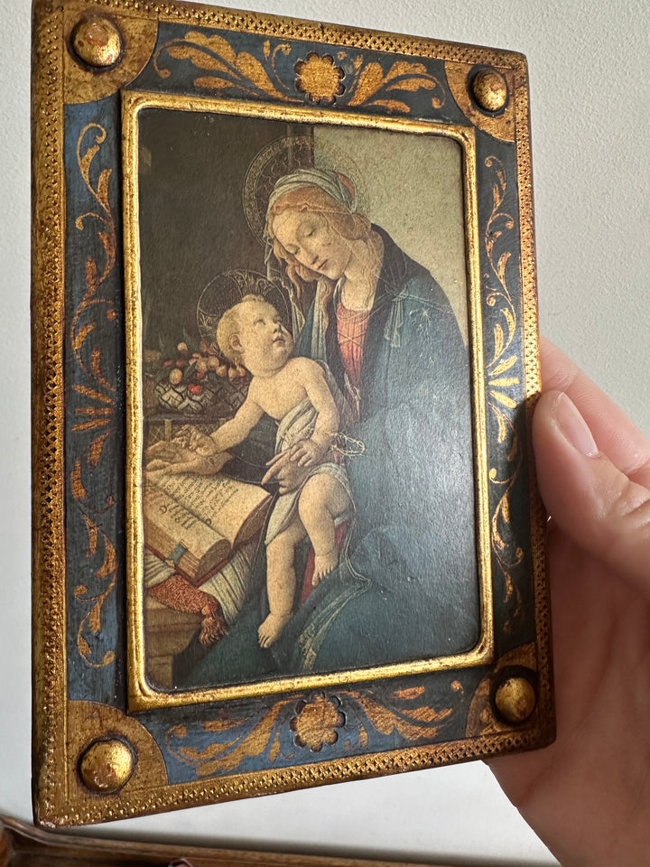 Belle icône florentine de la vierge. Image pressée sur bois. Support en bois peint. Estimation années 40. Objet ancien présentant de jolies traces du temps.