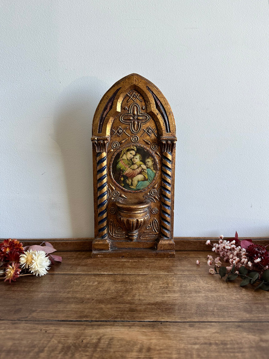 Belle icône florentine en bois doré. Décorée de deux colonnes sculptées. Représentation de la vierge à la chaise d'après Raphaël. Estimation années 40-50. Objet résolument imparfait présentant des traces du temps.