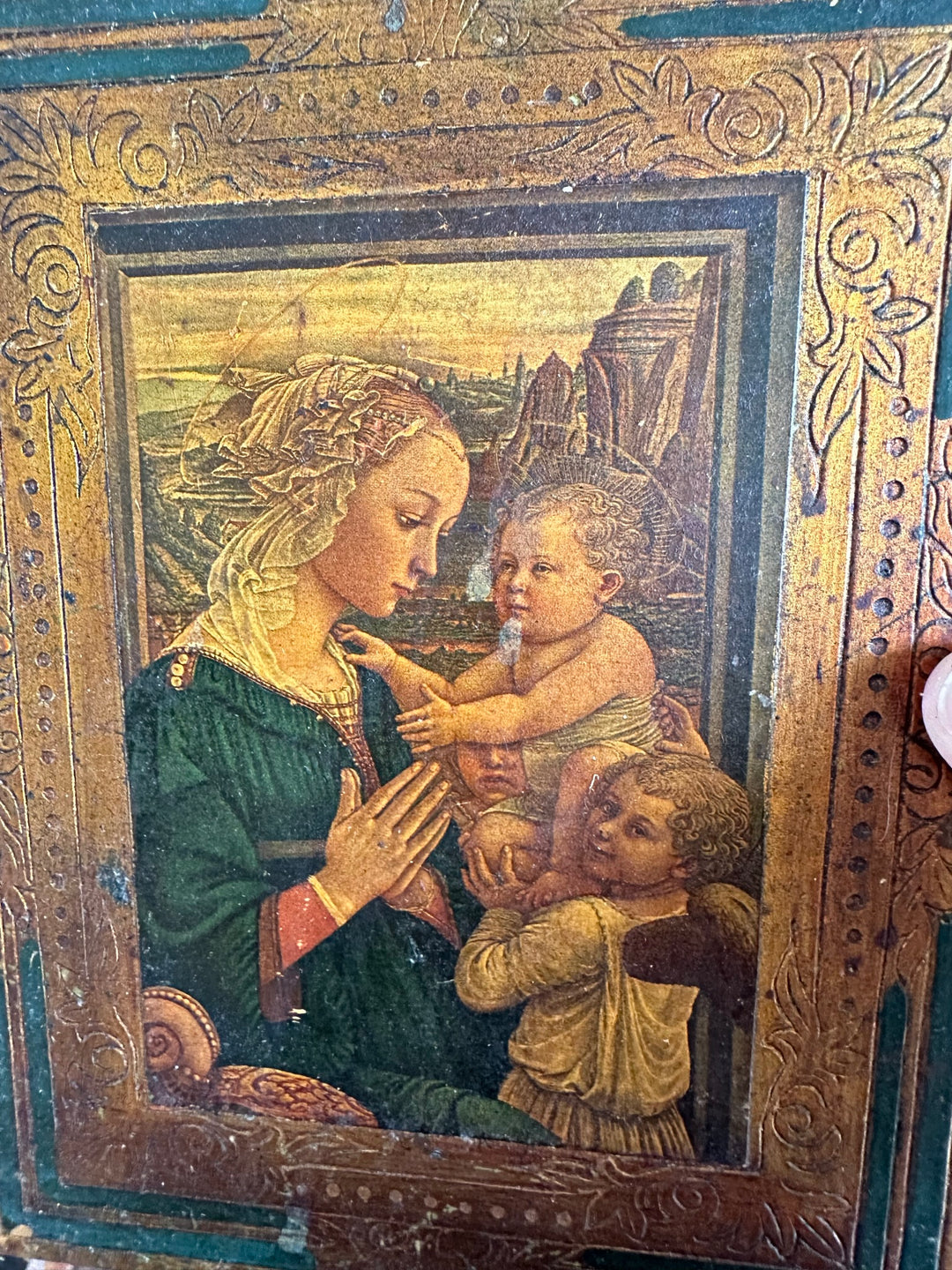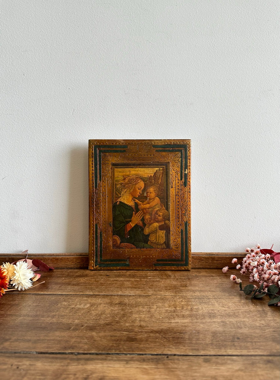 Une belle icône religieuse comme on les aime ! Ici une représentation de la Vierge à l'enfant et deux anges, de Fra Filippo Lippi. Icône en bois aux belles gravures et couleurs mordorées et bleues. Estimation années 30.