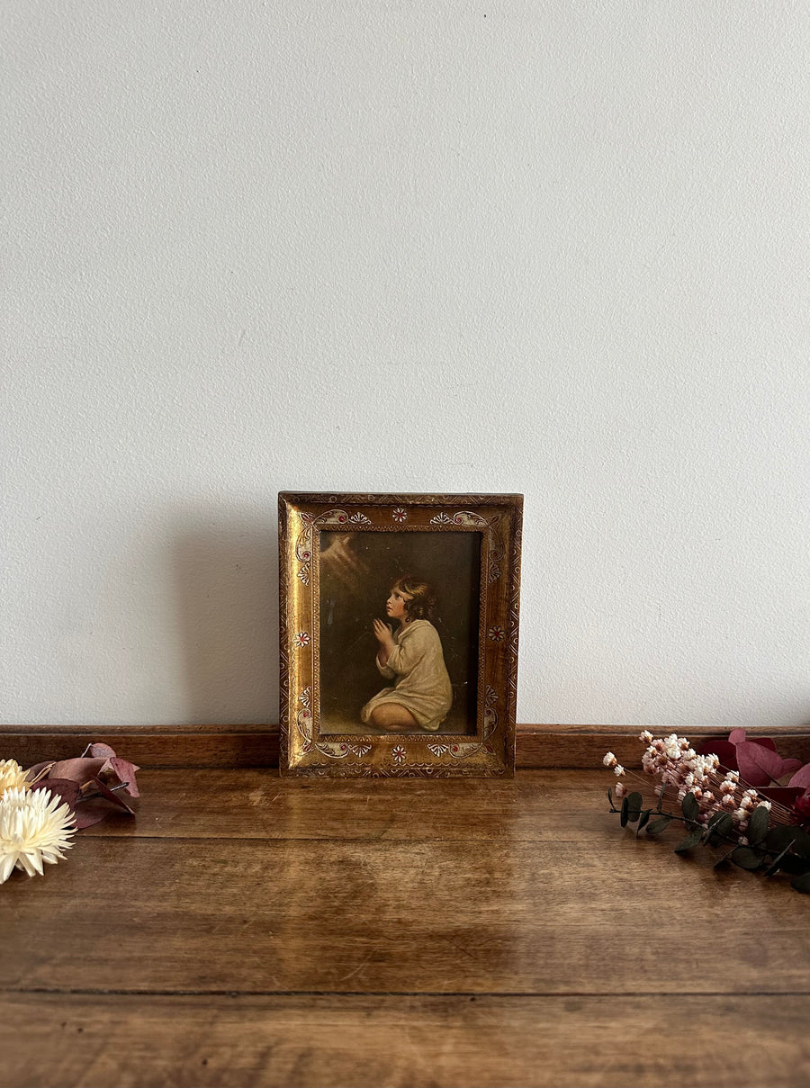 Jolie petite impression d'après l'Âge de l'Innocence façon icône. Cadre en bois doré style florentin. Estimation années 40-50. Objet patiné présentant de jolies traces du temps.
