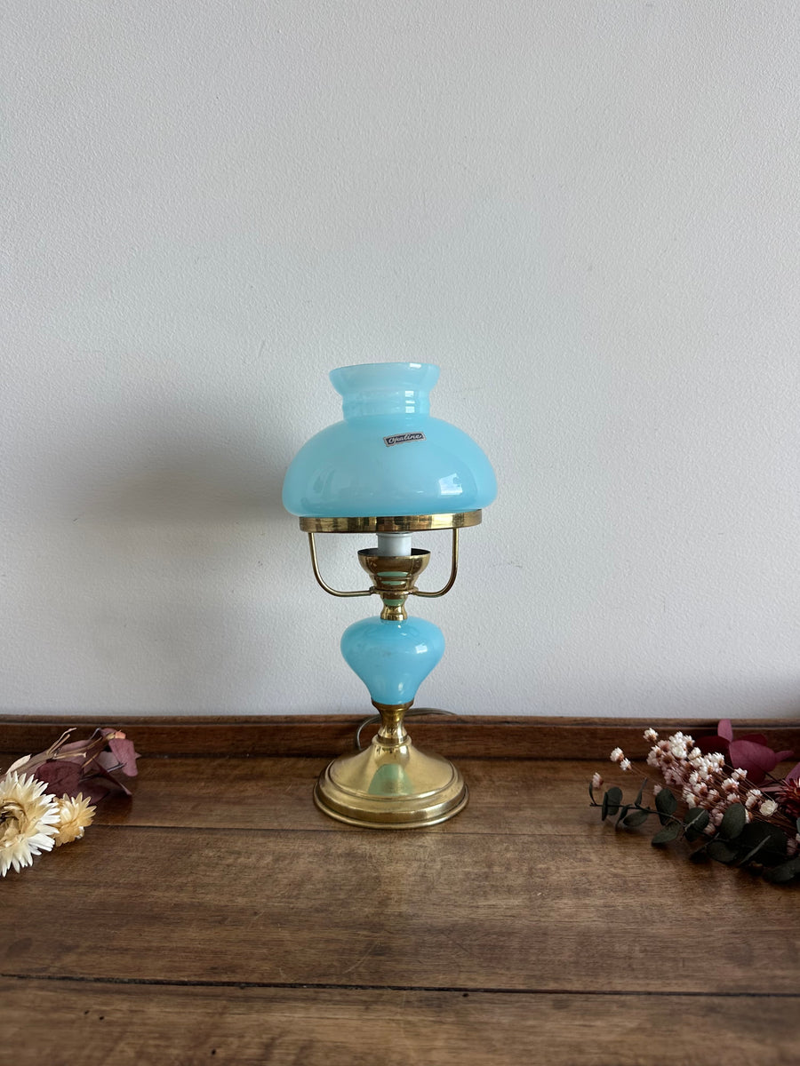 Adorable petite lampe de chevet en opaline bleue cerclée de laiton. Estimation années 60. A noter : le globe se pose à même le socle.