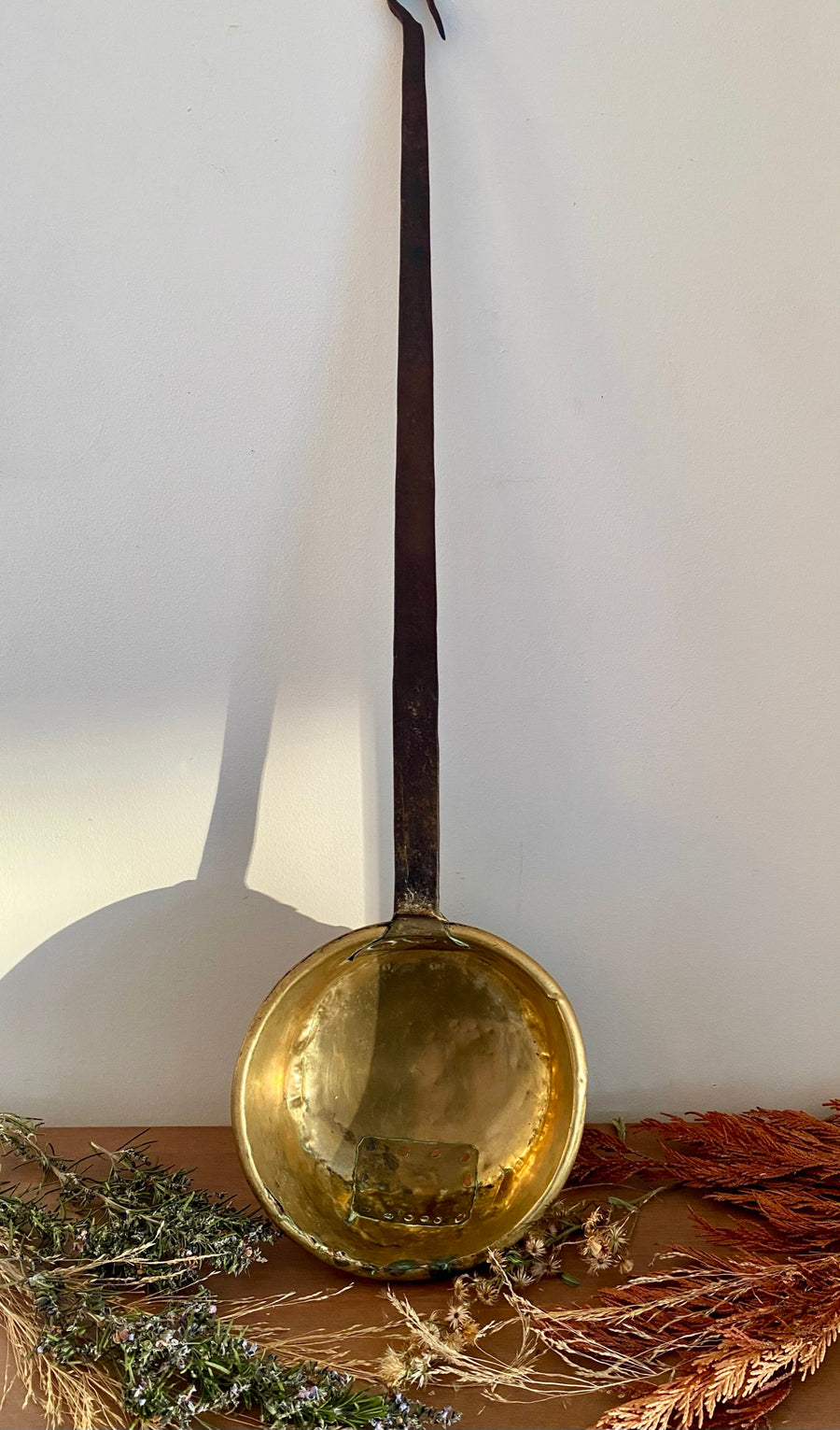 Ancienne louche à lait ou à eau e cuivre avec son long manche en métal.