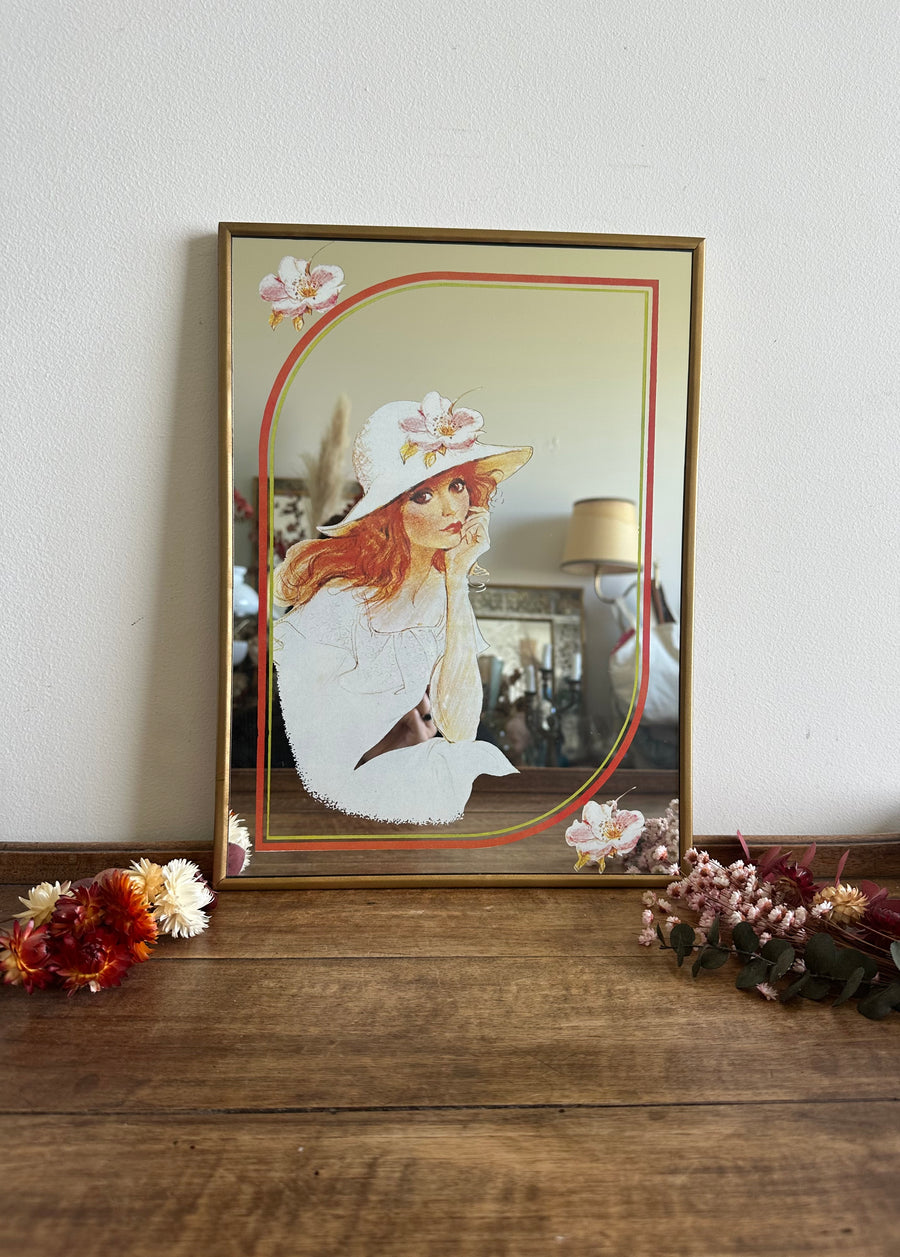 Charmant miroir cerclé de métal doré . Décoré d'une jeune fille au chapeau.