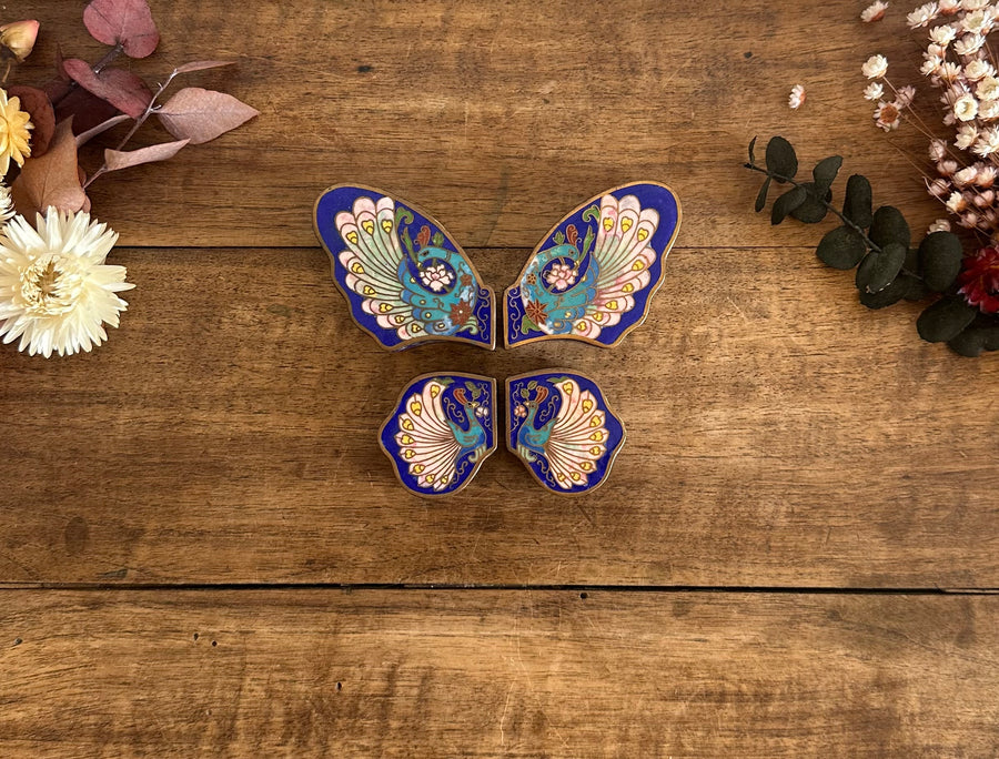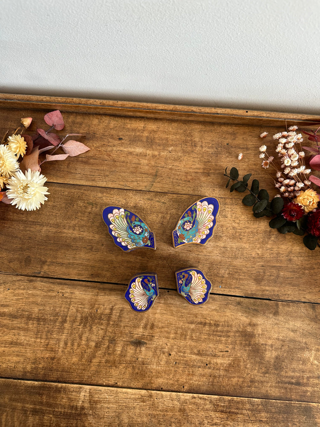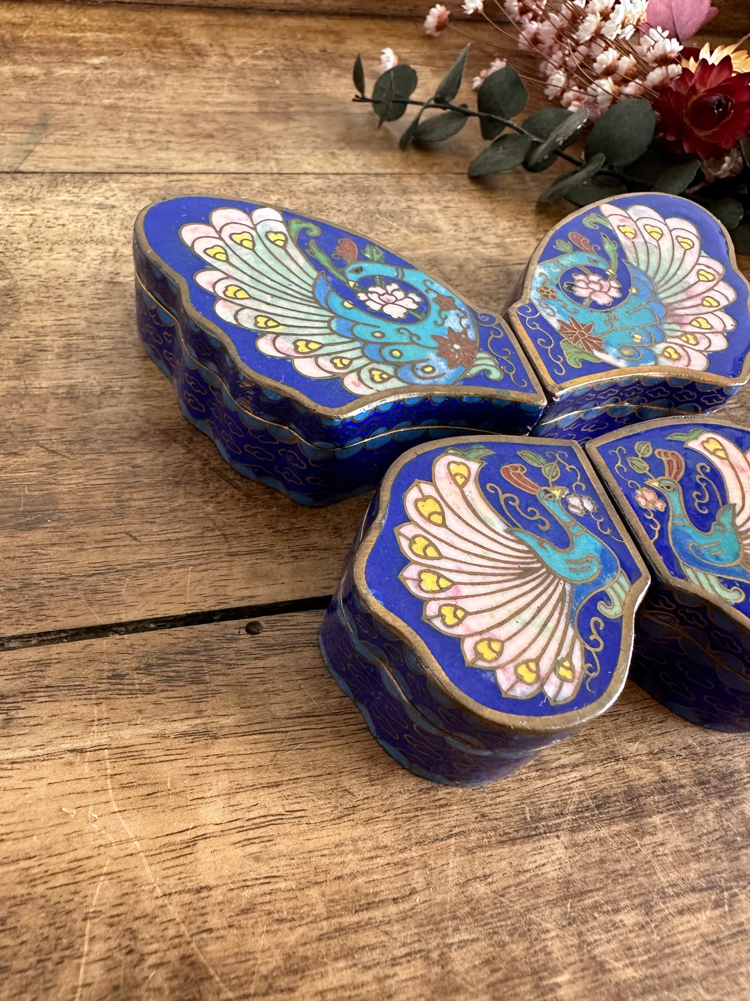Alerte aux collectionneurs. Coup de coeur pour ce joli papillon en laiton émaillé cloisonné, composé de quatre petites boîtes séparées. Motifs paons roses et bleus sur fond bleu nuit.