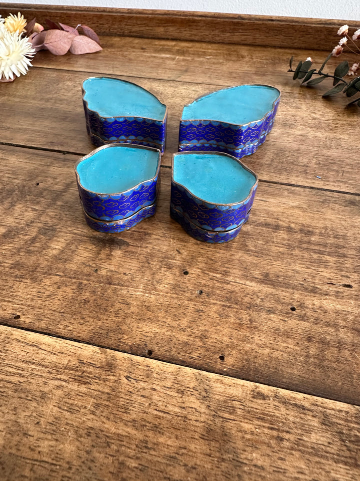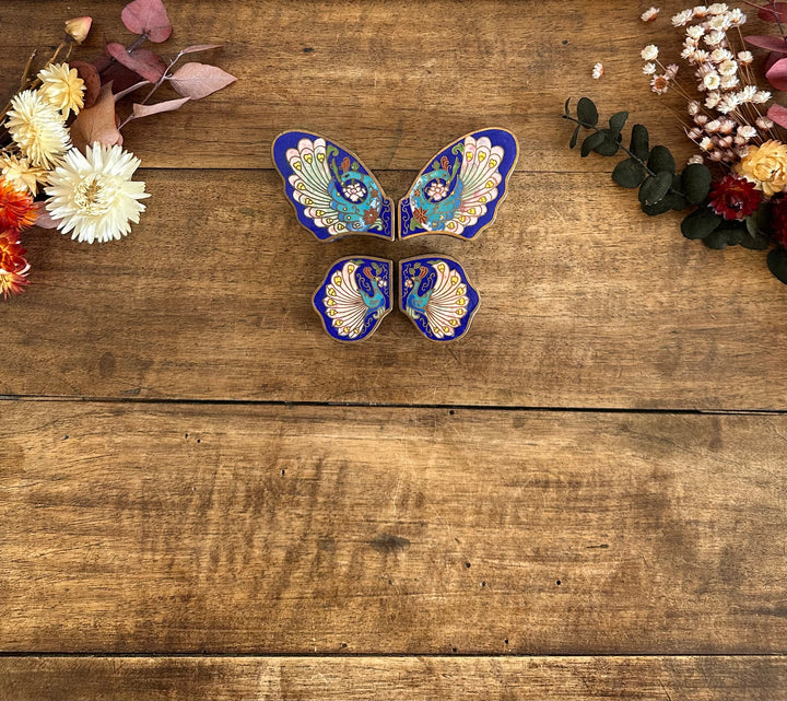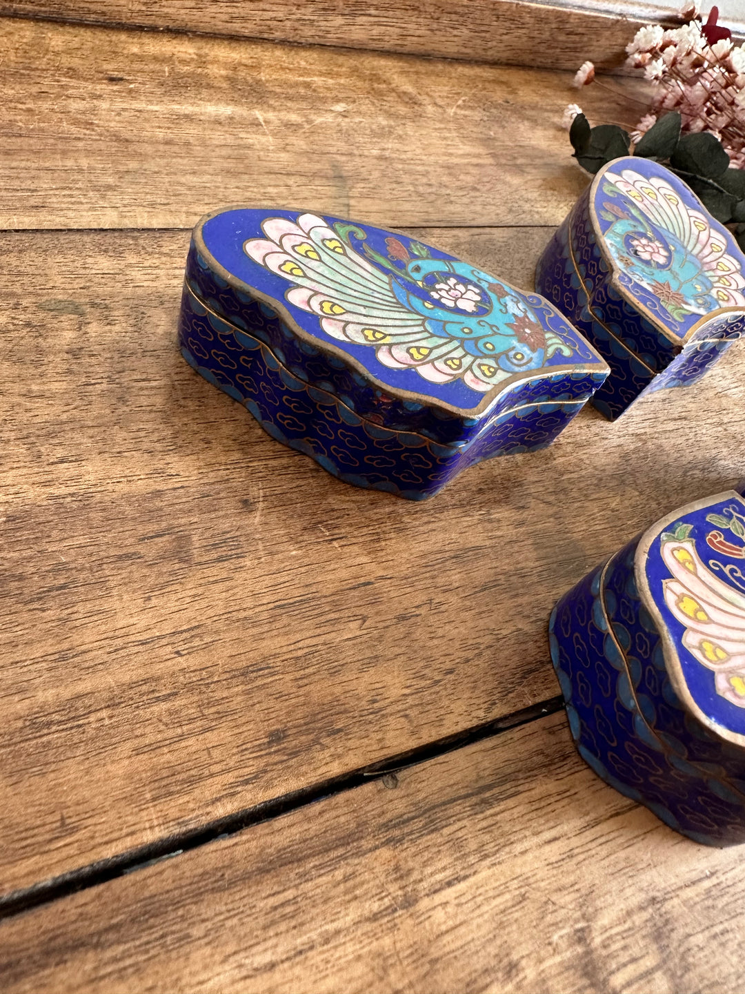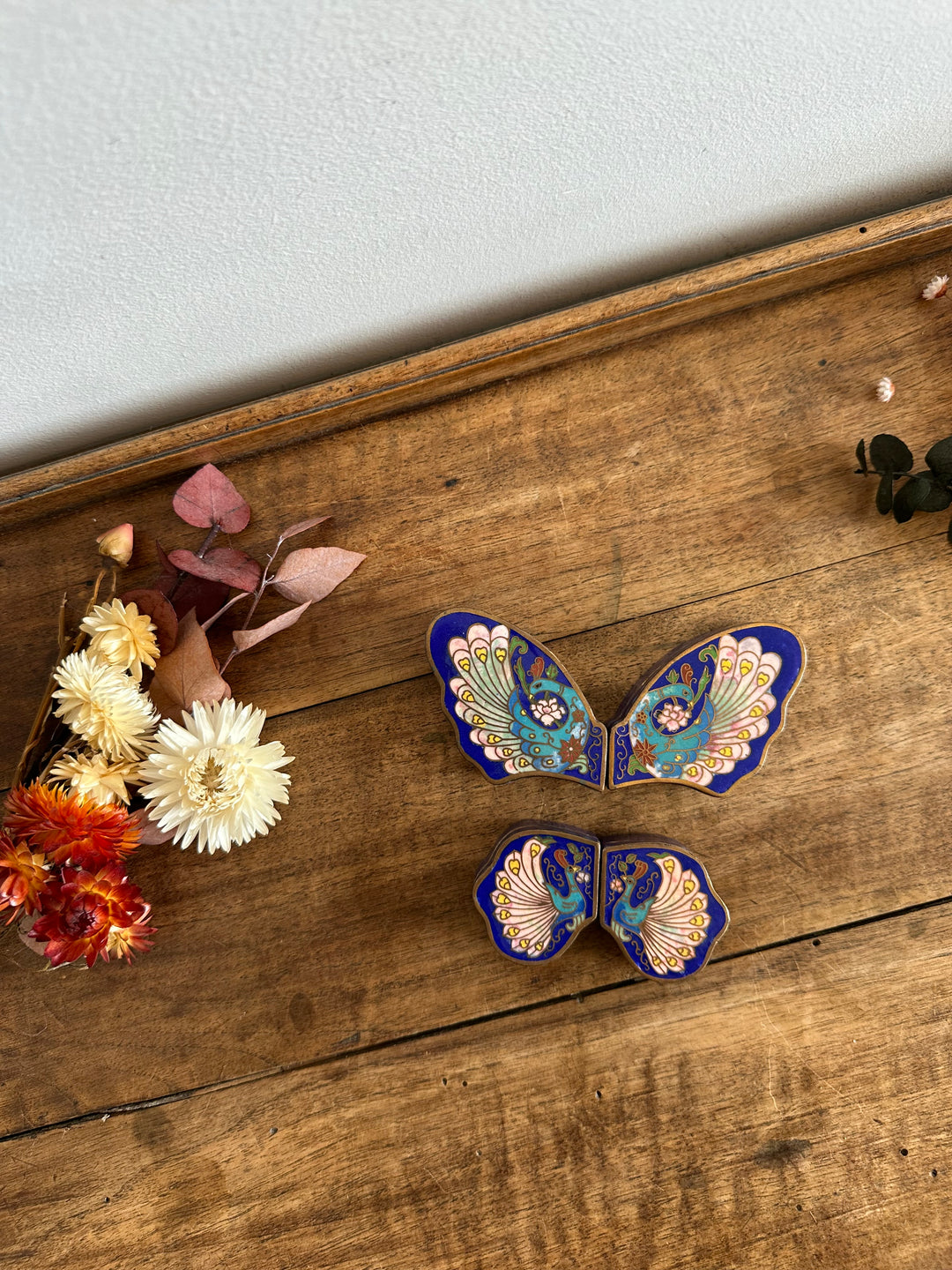 Alerte aux collectionneurs. Coup de coeur pour ce joli papillon en laiton émaillé cloisonné, composé de quatre petites boîtes séparées. Motifs paons roses et bleus sur fond bleu nuit.