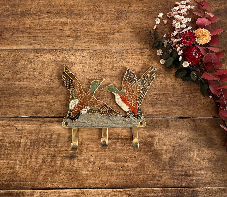 Adorable petite applique murale en laiton émaillé dotée de trois crochets. Décorée de deux canards. Sera parfaite pour accrocher vos torchons, clefs, laisses, ou vêtements légers. Estimation années 80.