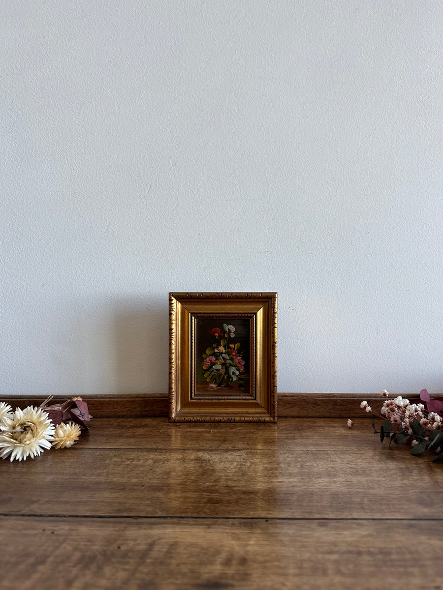 Belle petite peinture florale sur plaque de cuivre; Encadrement en bois doré. Estimation années 70.