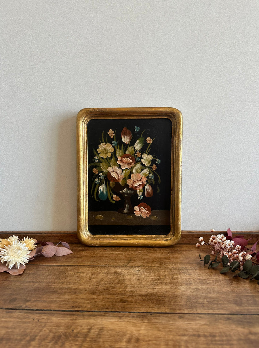 Peinture sur planche fond noir bords arrondis dorés années 40