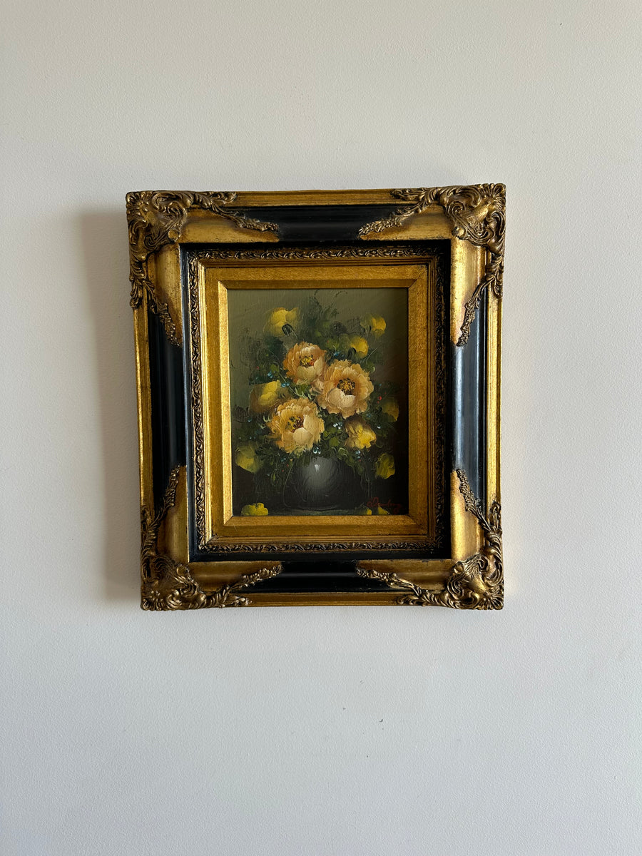 Coup de coeur pour cette délicate peinture sur toile signée. Bouquet de fleurs jaune sur fond sombre. On aime l'élégance de son beau cadre baroque en bois et stuc doré. Estimation années 50-60.
