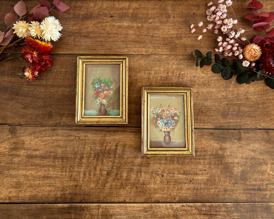 Ravissant duo de petites peintures florales dans leurs jolis cadres à poser. Estimation milieu XX ème.