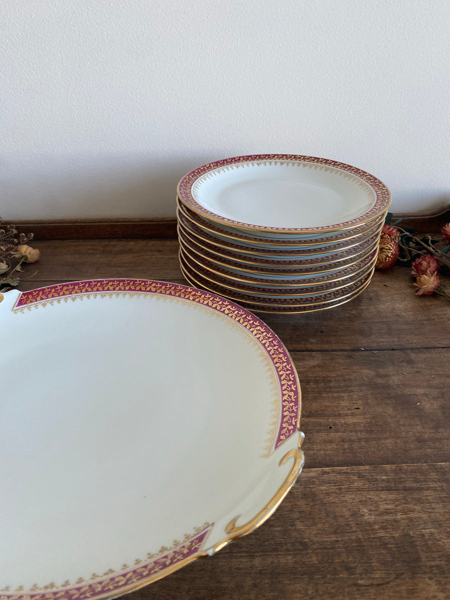 Ravissant service M&S Berry, PATE de LIMOGES, composé de 9 assiettes à dessert ornées d’un liseré fuchsia à feuilles dorées et d’un plat à gâteaux assorti.
