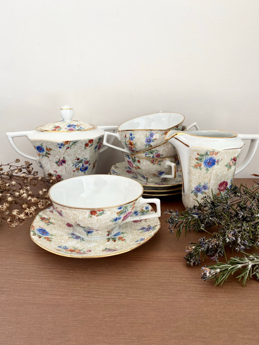 4 tasses et soucoupes, 1 pot à lait, 1 sucrière
