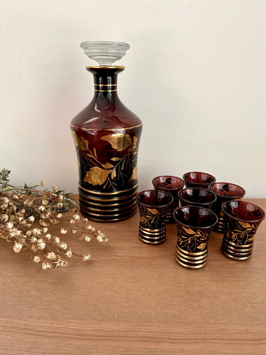 Carafe en verre décorée de feuillage doré. Sept petits verres assortis