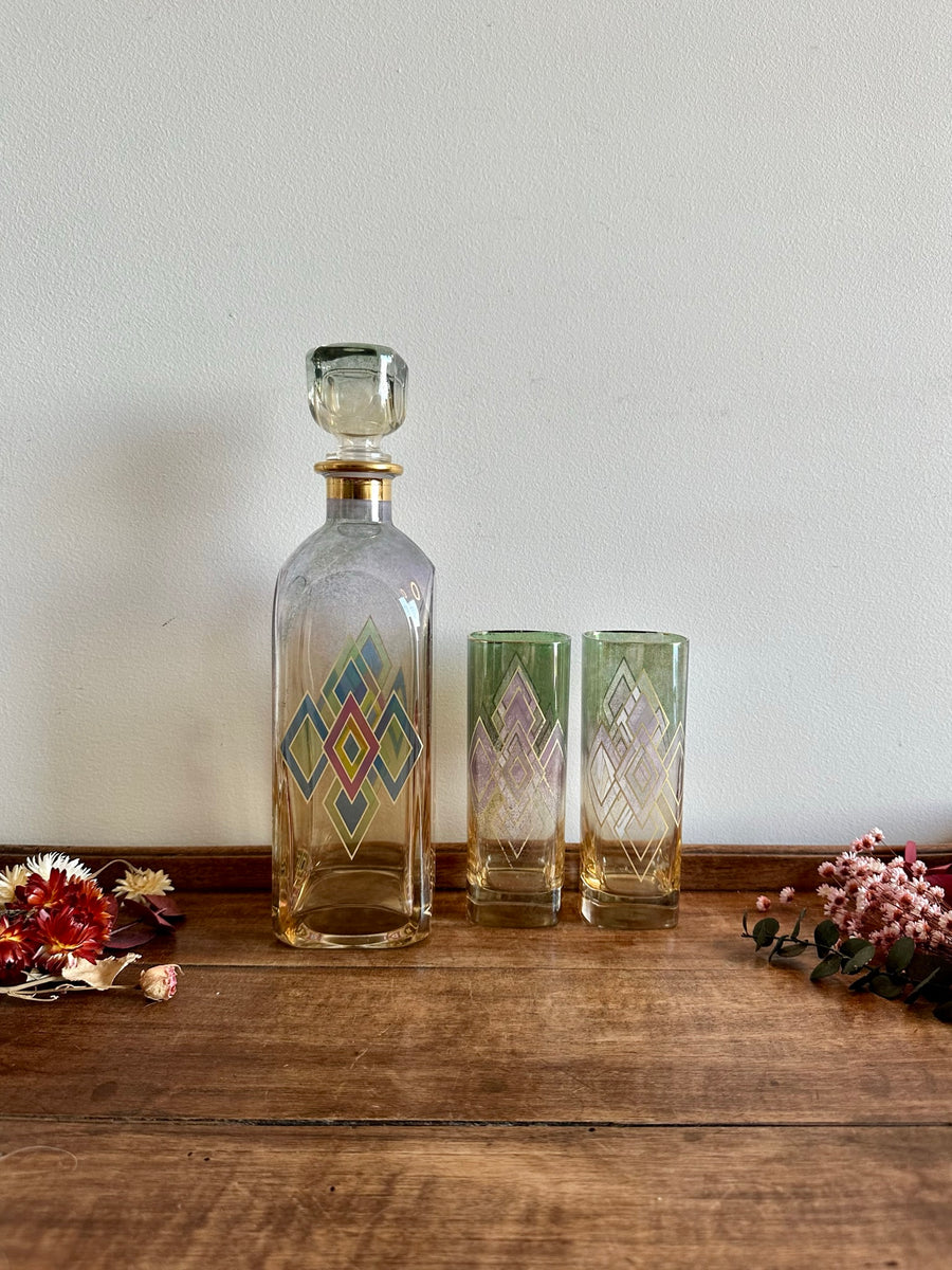Joli set à apéritif aux motifs géométriques composé de deux verres à fond épais, d'une carafe et d'un plateau en métal doré décoré de losanges. Plateau signé De Wan. Estimation années 60; Design très élégant, élément de déco idéal pour un buffet ou un mini bar !