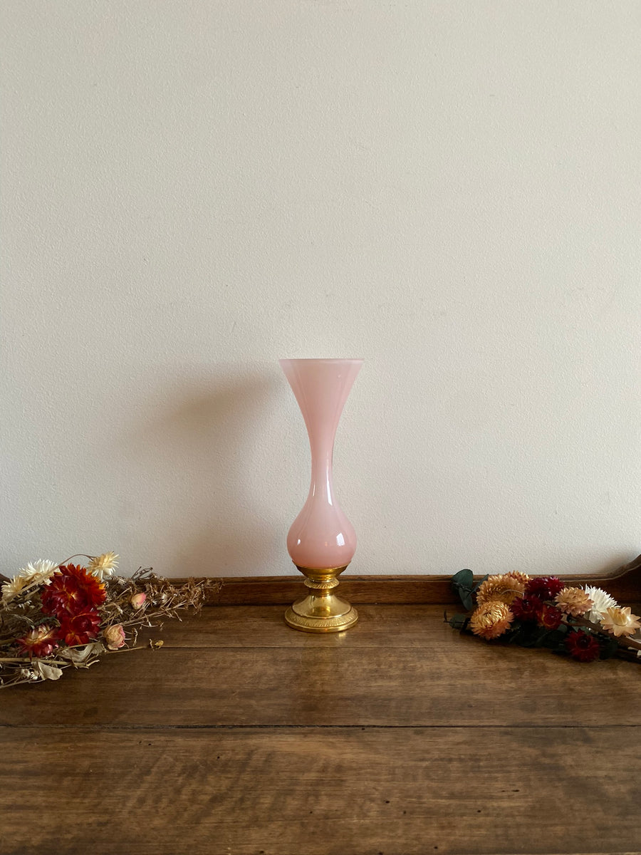 Charmant soliflore en opaline rose rehaussé d'un joli pied en métal doré