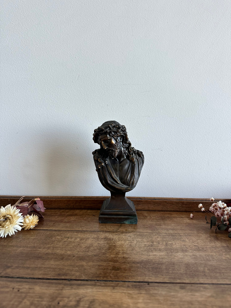 Belle petite statuette en bronze signée. Buste du Christ à la couronne. Signée au dos M Catineau. Estimation fin 19ème.
