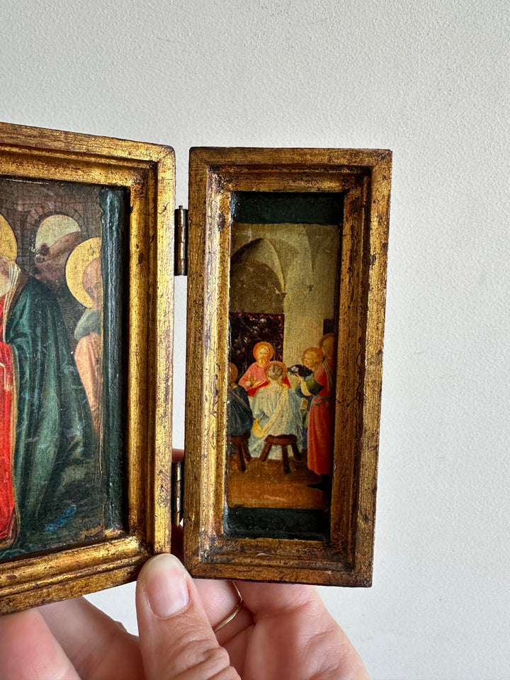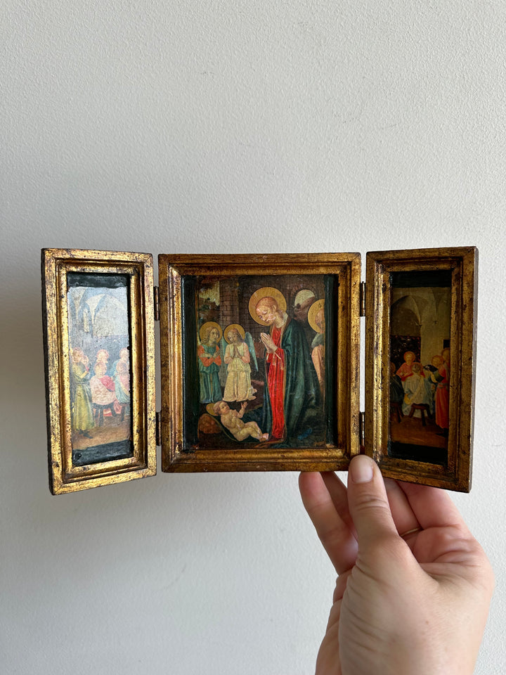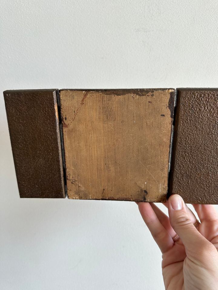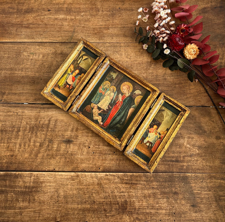 Charmant triptyque religieux en bois. Images de la vierge et de l'enfant Jésus pressées sur bois. Icône des années 70. À Noter, Icone à poser, ne dispose pas d'attache au dos.