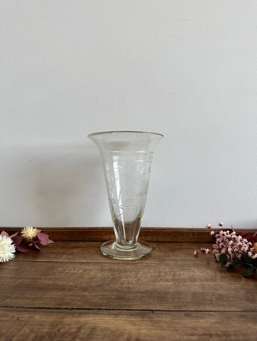 Charmant vase en cristal gravé de décorations florales. Estimation années 30.