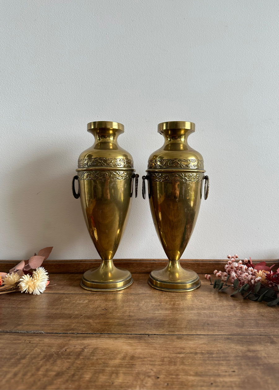 Joli duo de vases en laiton cuivré datant des années 50. Objets patinés présentant des traces du temps. Vendus séparément.